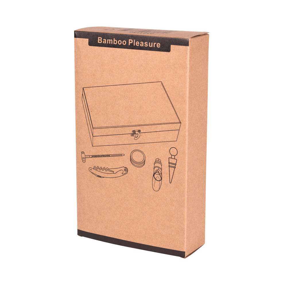 Weinset BAMBOO PLEASURE, in Bambus-Box, 6-teilig: mit Weinthermometer aus Glas, Edelstahl-Tropfring, Metall-Flaschenverschluss, Metall-Ausgießer und Edelstahl-Kellnermesser, in Box