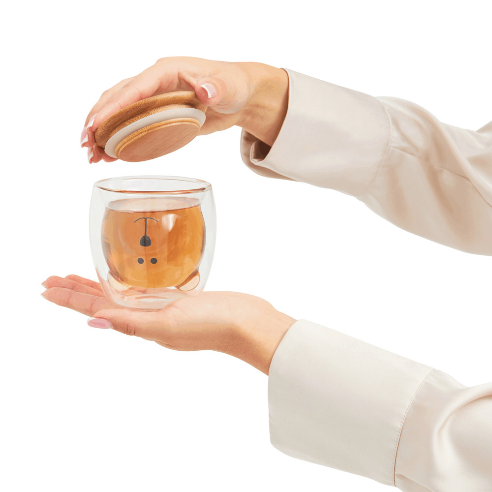 Glas BAMBOO BEAR: doppelwandig, Bambusdeckel mit Silikon-Dichtring, transparent, temperaturbeständig, Bärengesichtsform, Füllmenge ca. 250 ml, in Box