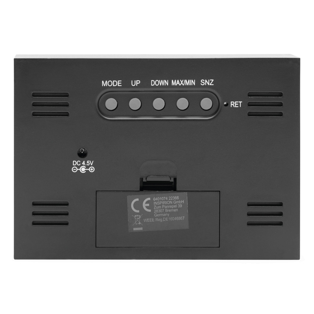 Wetterstation COLOUR: mit Alarmfunktion, Datums- und Zeitanzeige, Hygrometer und Thermometer (für °C und °F), beleuchtete LCD-Anzeige – schwarzes Display mit bunten Elementen, mit Anschlussmöglichkeit für Adapter (Adapter exkl.), batteriebetrieben (2x AAA Batterie nicht enthalten)