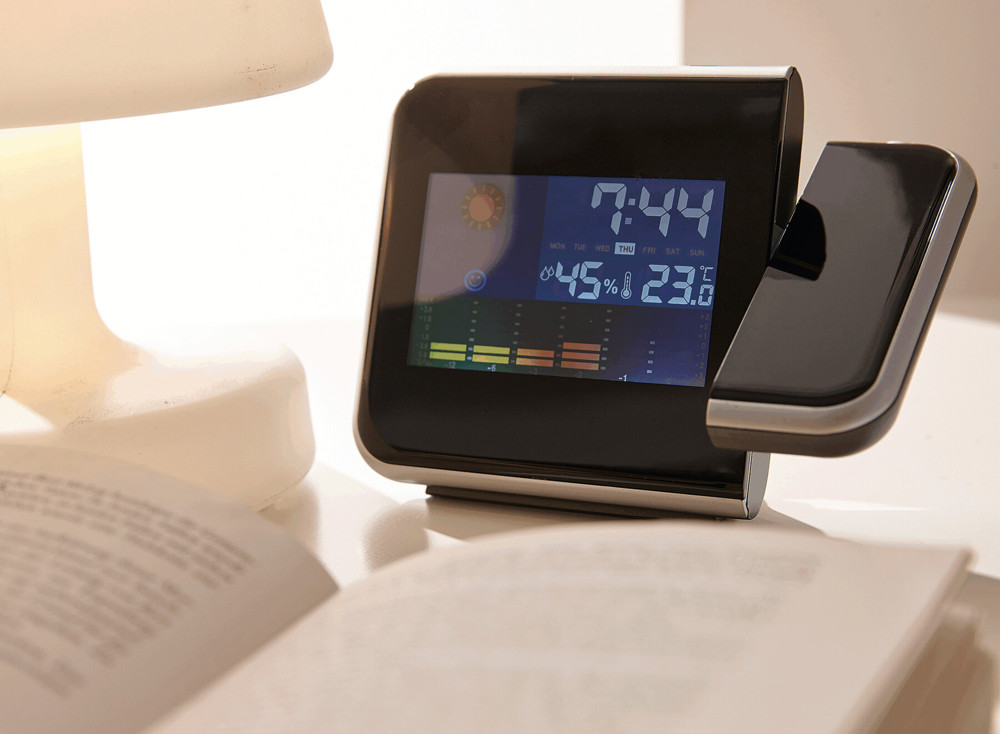 Projektionsuhr COLOUR PRO: mit roter LED-Projektion, Wetterprognose, Alarmfunktion, Datums- und Zeitanzeige, Hygrometer und Thermometer (für °C und °F), beleuchtete LCD-Anzeige – schwarzes Display mit bunten Elementen, ausklappbarer Aufsteller auf der Rückseite, mit Anschlussmöglichkeit für Adapter (Adapter exkl.), batteriebetrieben (2x AAA Batterie nicht enthalten)