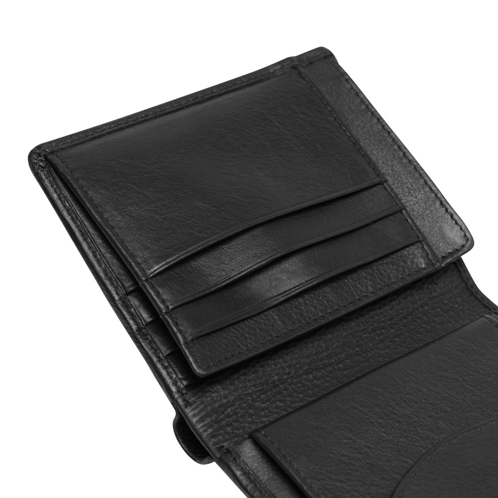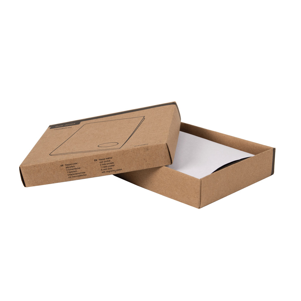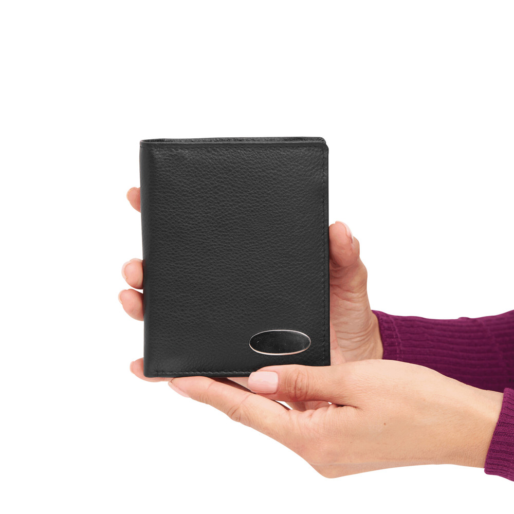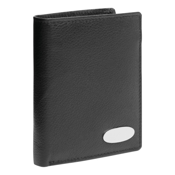 Echtleder-Geldbörse DOW JONES - im Hochformat: innen 6 Einsteckfächer für Geldkarten, 2 Geldscheinfächer, 1 Münzfach mit Druckknopfverschluss für Kleingeld, 1 Netzfach, 4 zusätzliche Fächer, 1 Fach für Einkaufswagen-Chip - außen mit ovaler Metallplatte für eine Werbeanbringung, in Box
