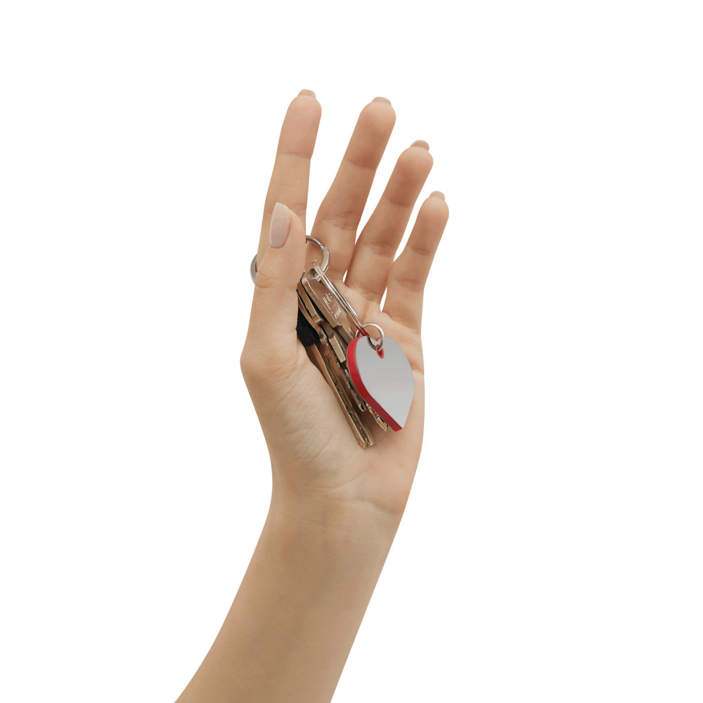 Schlüsselanhänger EVERLASTING LOVE: rotes Kunststoffherz zwischen hochglanzpolierten Stahlherzen, mit Schlüsselring