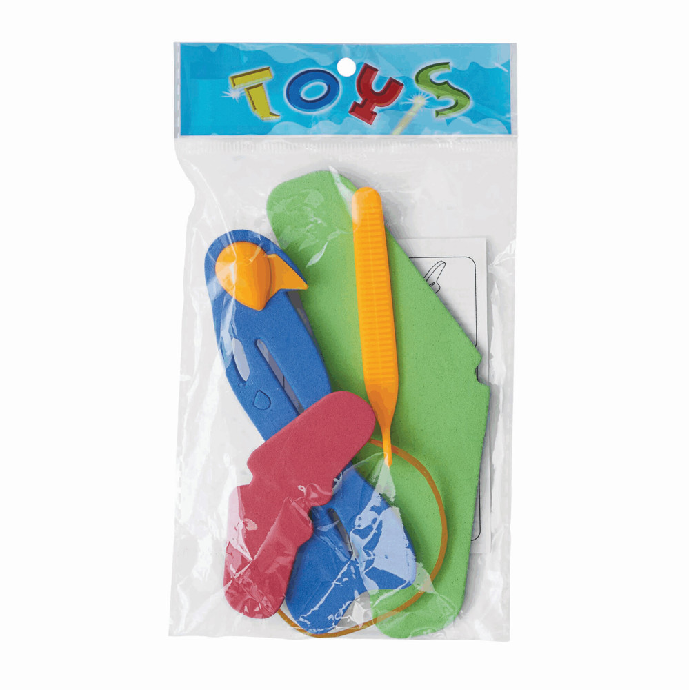 Flugzeug SKY HOPPER zum Zusammenbauen, 4-teilig: bestehend aus Kunststoff-Schleuder mit Gummiband, 3 Teile aus Moosgummi, verpackt im Beutel