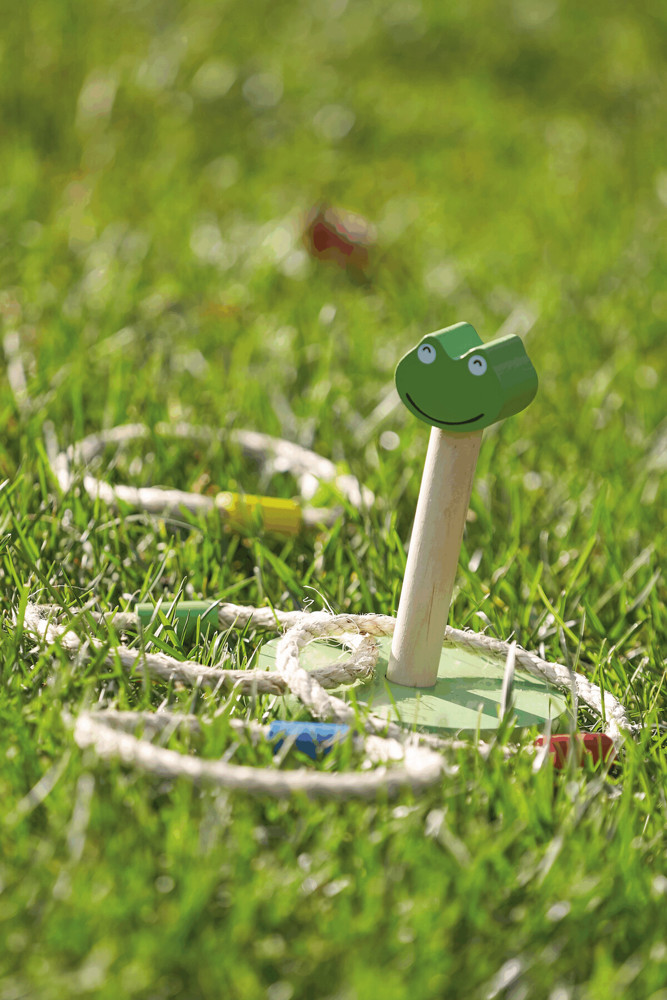 Ringwurfspiel CRAZY LOOP, aus Holz: in Froschoptik, inkl. 4 Wurfringe mit farbig abgesetzter Holzmarkierung
