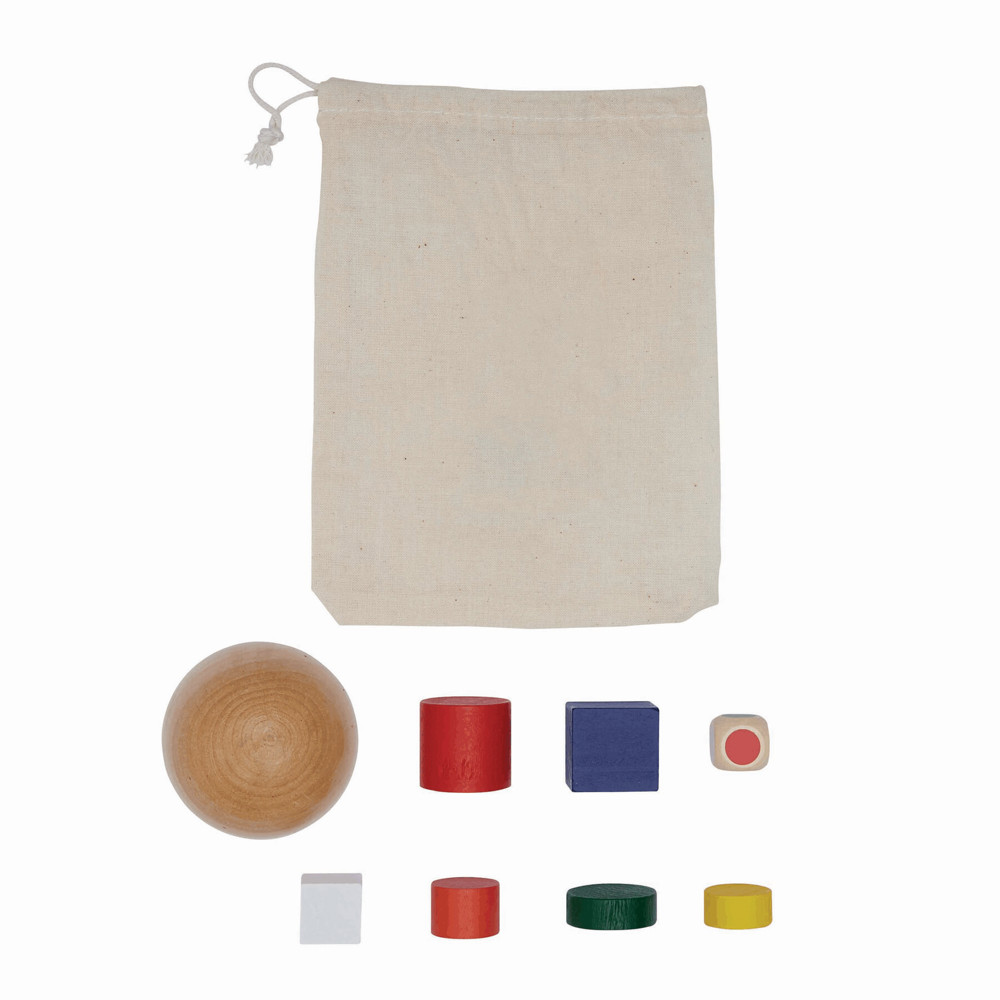 Geschicklichkeitsspiel CRAZY TOWER: bestehend aus 1 kleinen Halbkugel, 6 Spielsteinen und 1 Würfel aus Holz, inkl. Spielanleitung, im umweltfreundlichen Baumwollbeutel