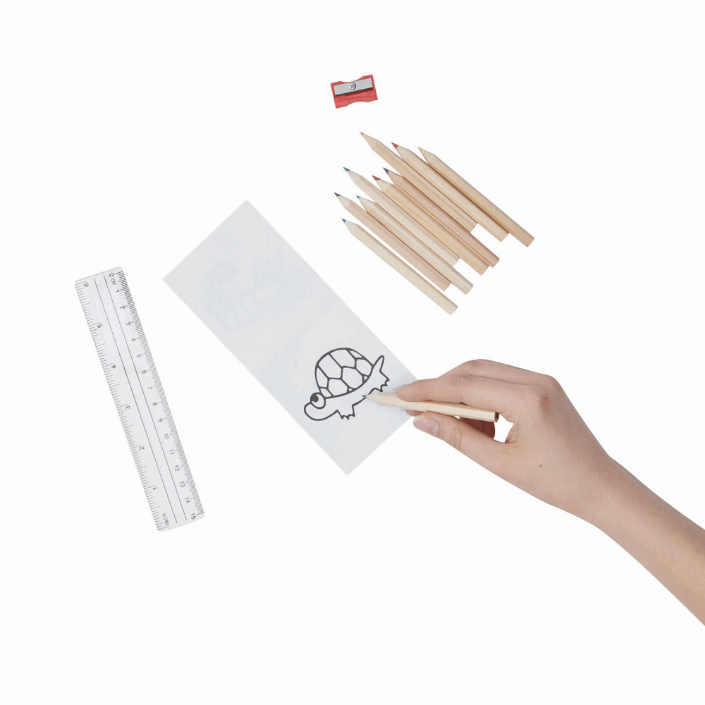 Malset BEING BUSY: bestehend aus Malbuch (10 Seiten mit verschiedenen Tiermotiven und 10 leeren Seiten) zum Ausmalen, 10 kleinen Naturholz-Buntstiften (angespitzt), Lineal (15 cm) und Anspitzer, in Box