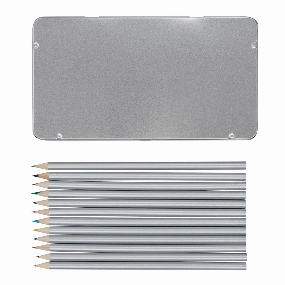Lange Buntstifte SILVERSTAR: 12 Stück, verschiedenfarbig, silber lackiert, angespitzt, in Metallbox