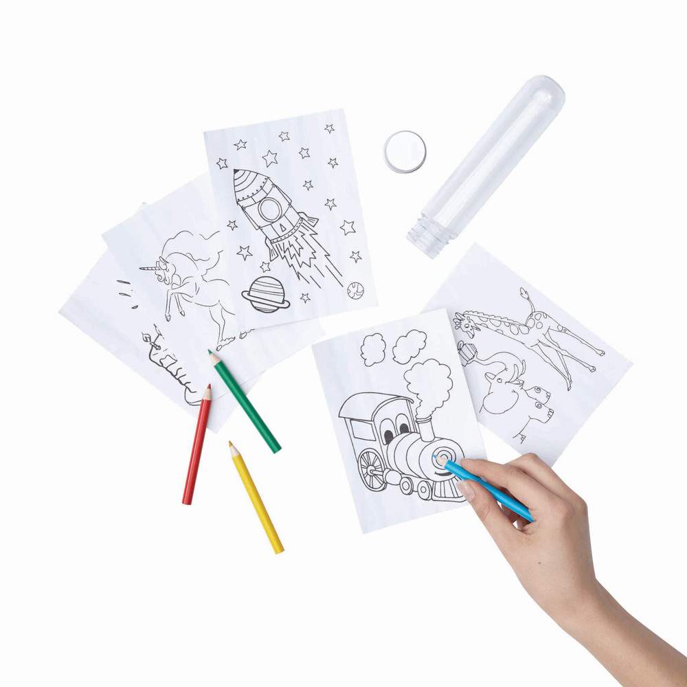 Malset TUBY: bestehend aus 5 Malblättern mit verschiedenen Motiven zum Ausmalen, 4 lackierten Buntstiften (angespitzt), in Dose