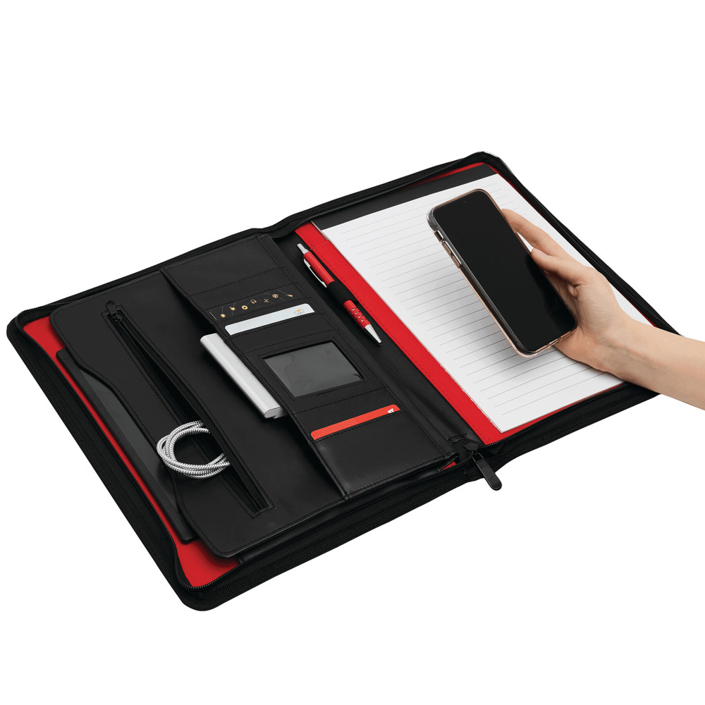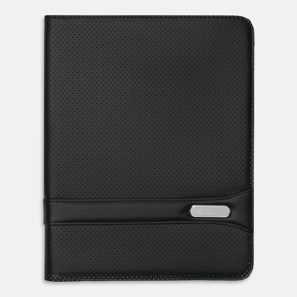 Portfolio MANHATTAN im DIN-A4-Format: umlaufender Reißverschluss zum Verschließen, innen diverse Einsteckfächer, 1 Klarsichtfach, 1 Reißverschluss-Innenfach, inkl. Schreibblock (liniert), Schlaufe für 1 Schreibgerät - außen in gestanzter Loch-Optik mit Metallplättchen für Ihre Werbeanbringung