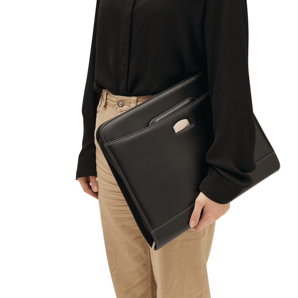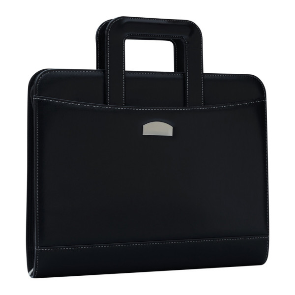 Dokumentenmappe NOBLESSE RING im DIN-A4-Format: umlaufender Reißverschluss zum Verschließen, innen diverse Einsteckfächer, 1 Klarsichtfach, 4-Ring-Mechanik, inkl. Schreibblock (blanko), Schlaufe für 1 Schreibgerät, Taschenrechner, außen versenkbare Tragegriffe, dekorative Ziernähte, in Leder-Optik mit Metallplättchen für Ihre Werbeanbringung