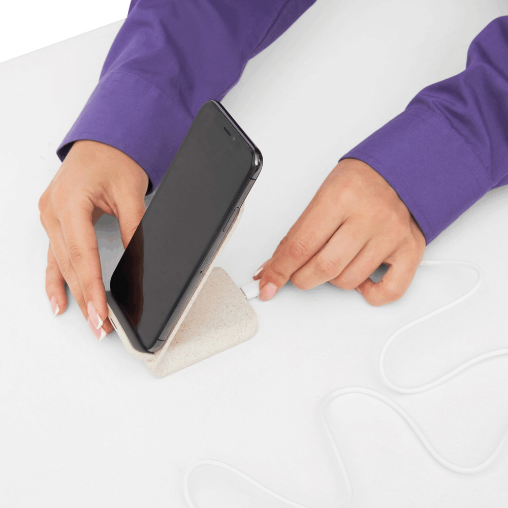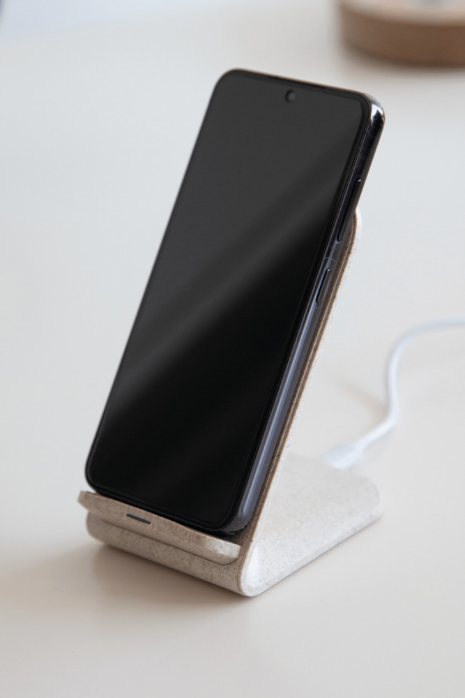 Drahtlose Ladestation INDUCTIVE: kabelloses Aufladen des Gerätes durch Auflegen auf die Kontaktfläche (Gerät muss für induktives Laden gerüstet sein), inkl. USB-Ladekabel mit USB Typ C Stecker (Länge: ca. 102 cm), während des Ladevorgangs leuchtet die Kontrollleuchte blau, nach Abschluss des Ladens grün, Eingangsleistung: 5V/2A, 9V/2A, Ausgangsleistung: 15W (max.), mit Temperaturkontrolle und Fremdkörpererkennung, 4 rutschhemmende Füße auf der Unterseite, aus 35 % Weizenstroh und 65 % ABS, in Box