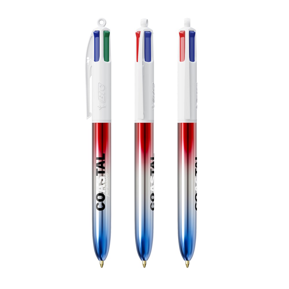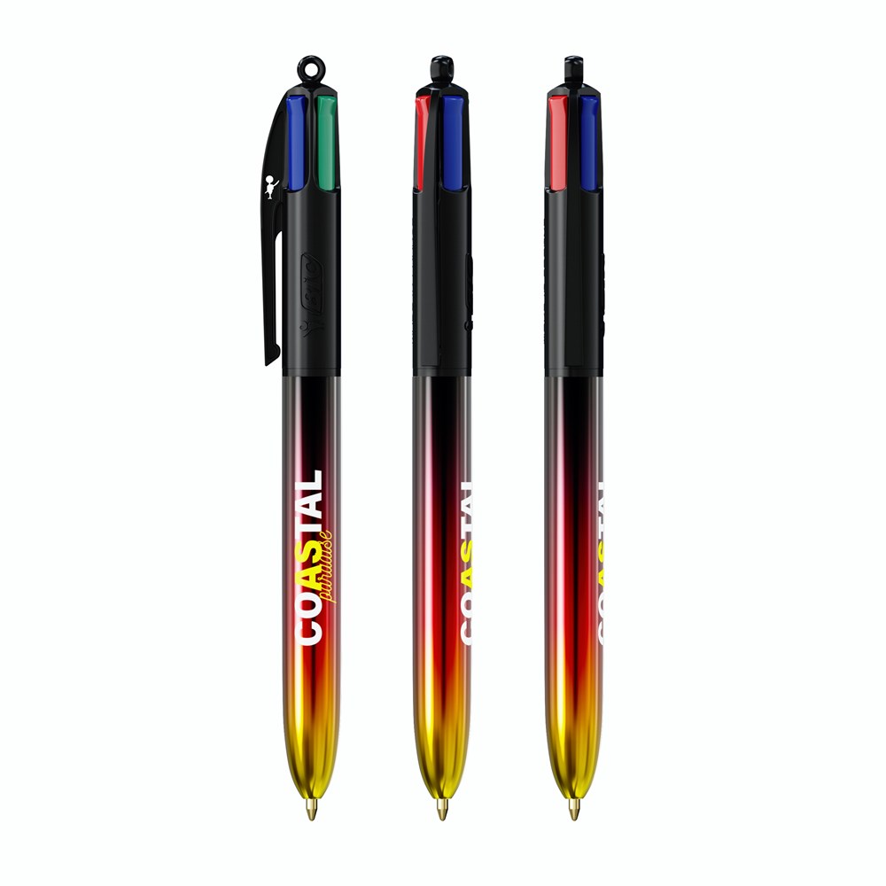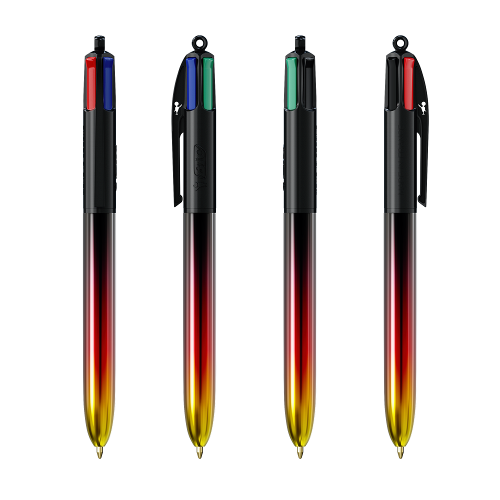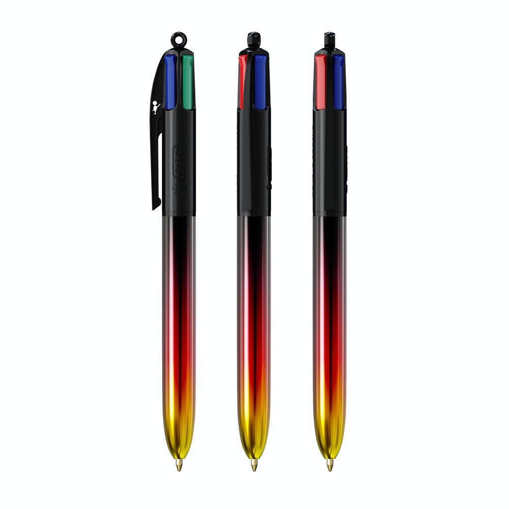 Entdecken Sie unseren BIC® 4 Colours® Flags Collection Kugelschreiber mit metallischem, glänzendem und farbverlaufenden Effekt. Dieses Finish ermöglicht es uns, verschiedene Farbtöne auf dem gleichen Schaft zu mischen. Tauchen Sie ein in unser Farbuniversum! Unser legendärer BIC® 4 Colours ® ist jetzt nachhaltiger, mit 13% weniger Kunststoff im oberen Bereich!