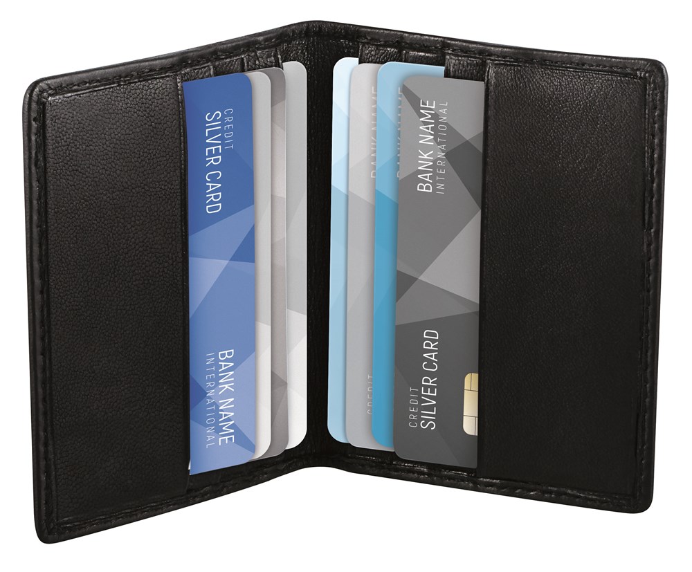 Schickes und kompaktes Echtleder-Kreditkarten-Etui für bis zu 8 Kredit- und/oder Visitenkarten. Schützt Ihre Karten durch eine spezielle blockierende RFID-Einlage gegen Skimming. (Beim Skimming werden illegal Kartendaten ausgelesen, in dem Daten vom Magnetstreifen berührungsfrei über einen Scanner ausgelesen und auf gefälschte Karten kopiert werden).