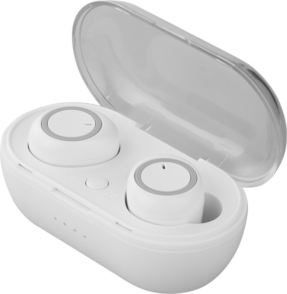 Set mit zwei TWS Wireless 5.0 Stereo Ohrhörern und Ladestation.