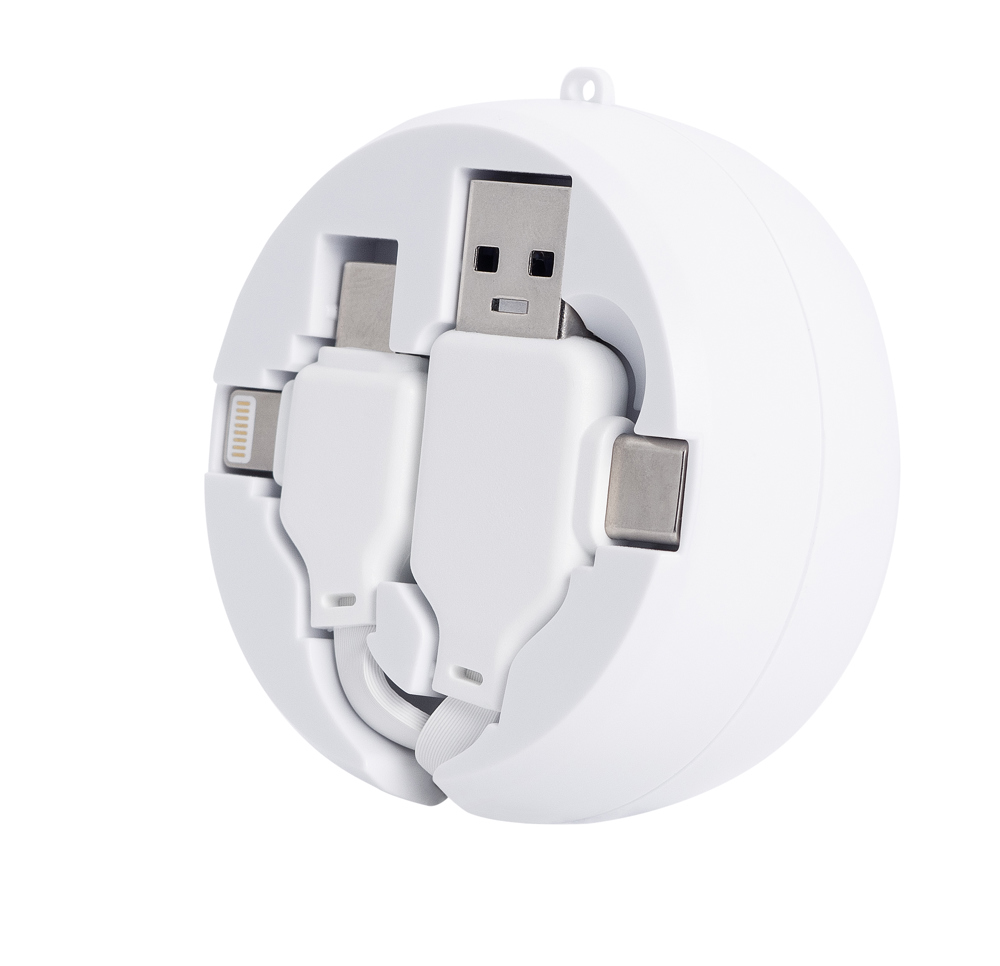 Kabeltrommel mit allen wichtigen Anschlüssen (USB-A, Typ-C und Lightning),