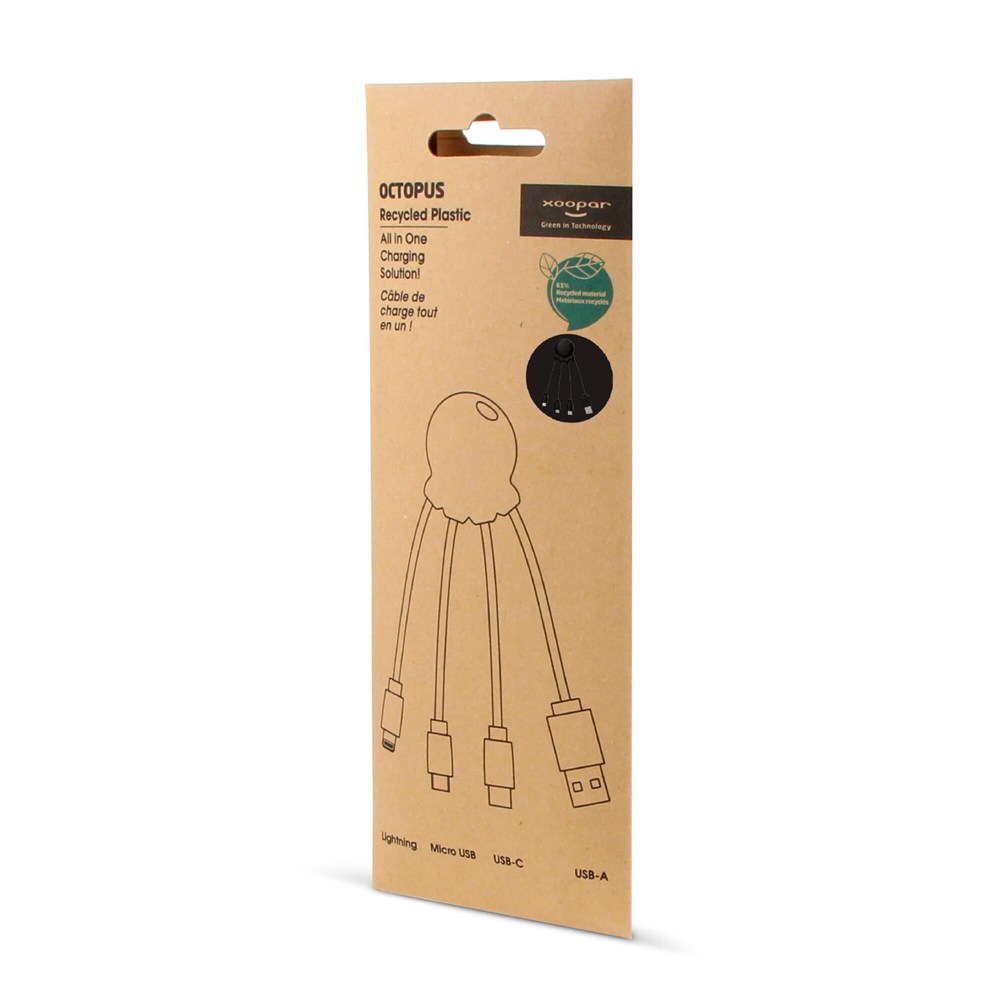 Das Eco Octopus Ladekabel ist aus RPET (Kabel) und recyceltem Kunststoff (Gehäuse) hergestellt. Mit einem USB-Eingangsstecker und drei verschiedenen Steckern können Sie Ihre Geräte umweltfreundlich aufladen. Ob am Schreibtisch, im Auto, in der Tasche oder im Urlaub, dieses Multiladekabel ist immer praktisch! Der Gesamtanteil an recyceltem Material beträgt 61 %, bezogen auf das Gewicht des Artikels. Das Kabel ist in einem nachhaltigen, FSC-zertifizierten Papierumschlag verpackt.