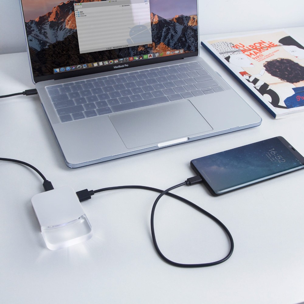 Plug and Play, keine Treiber erforderlich. Die Acrylplatte leuchtet während des Gebrauchs. Kompatibel mit Windows XP / Vista / 7 / 8 / 10 (32/64 Bit) und Mac OS 10.x oder höher.
