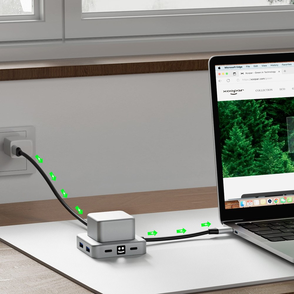Hier gibt es keine Kompromisse! Unser Hub ist aus recyceltem Aluminium gefertigt, bietet eine stressfreie Rotation, unterstützt das Laden von Laptops mit bis zu 100 W PD und verfügt über mehrere Anschlüsse - 2 USB-A, 2 USB-C, HDMI und einen Audioanschluss. Erhöhen Sie Ihre Konnektivität auf nachhaltige Weise!