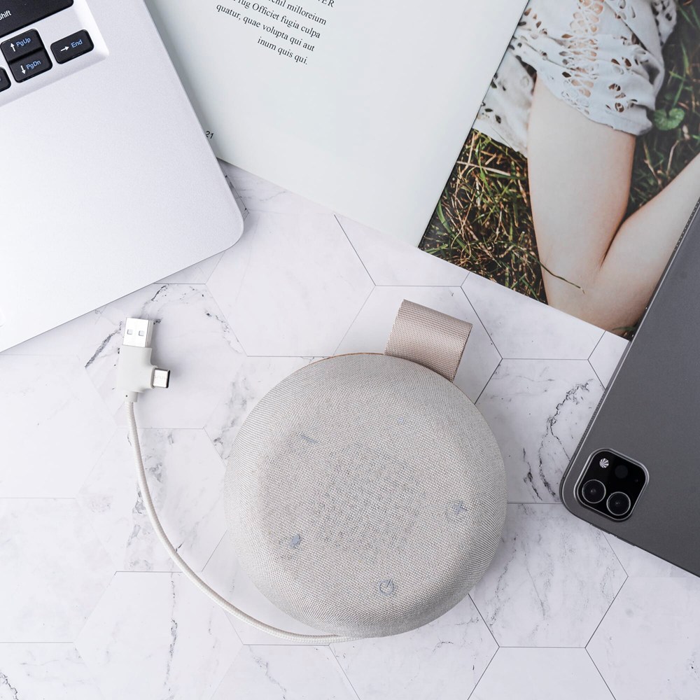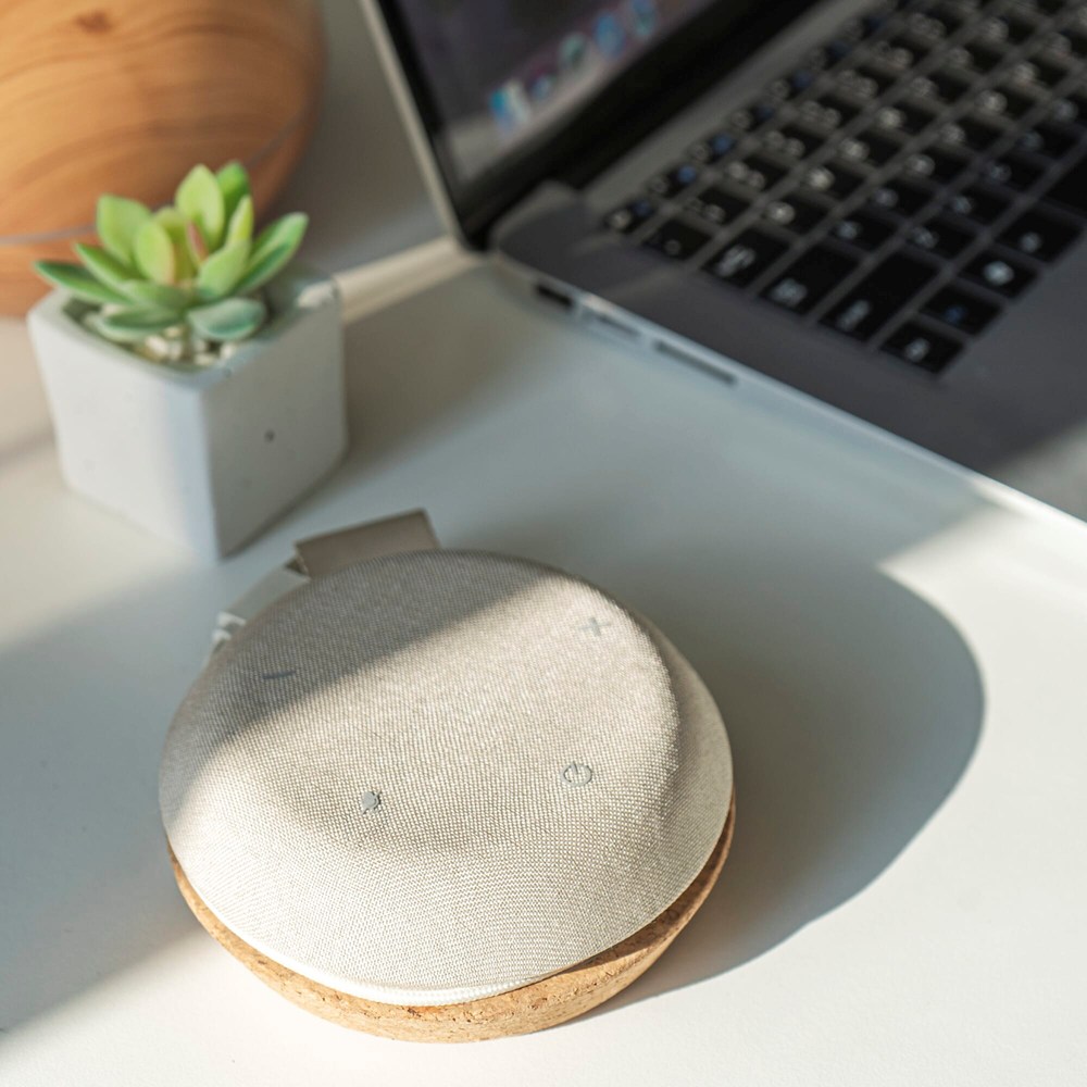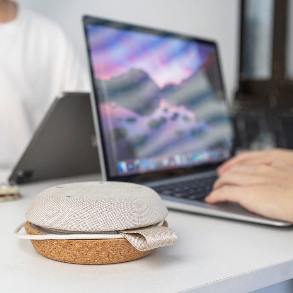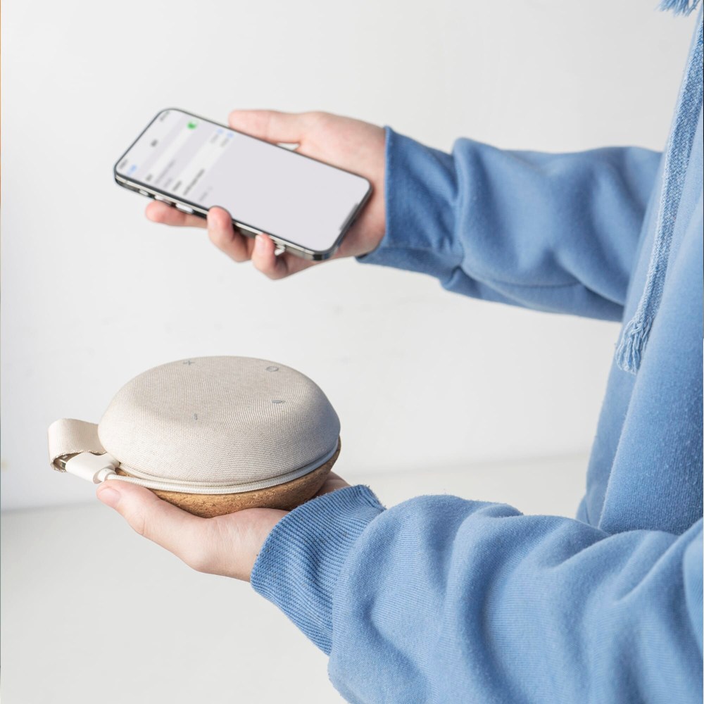 Kompakter tragbarer Lautsprecher. Starten Sie überall eine Telefonkonferenz. Das Meetair eignet sich auch hervorragend zum Hören von Musik. Das versteckte Kabel hat einen Eingangsadapter für USB und USB-C. Der Lautsprecher verfügt über zwei Mikrofone, so dass er überall aufgestellt werden kann. Außerdem wird jegliches Umgebungsgeräusch unterdrückt.