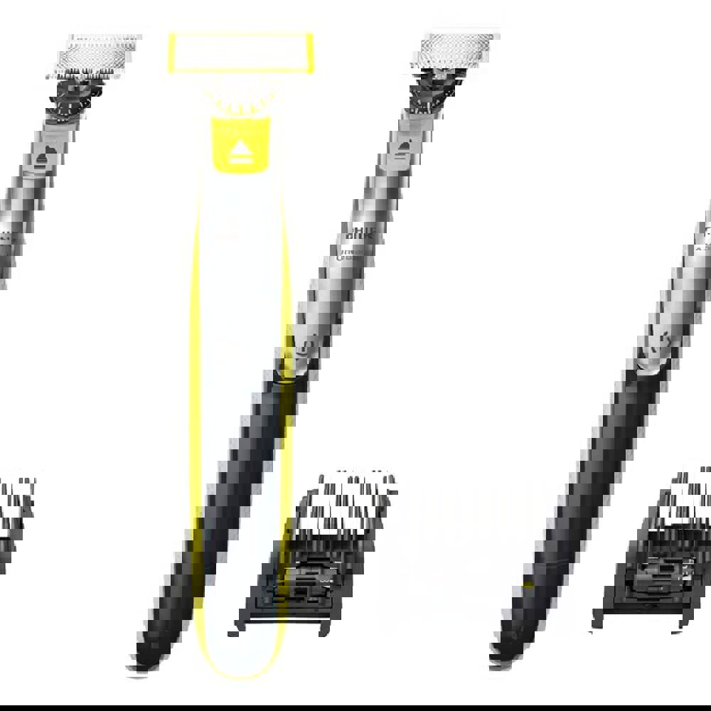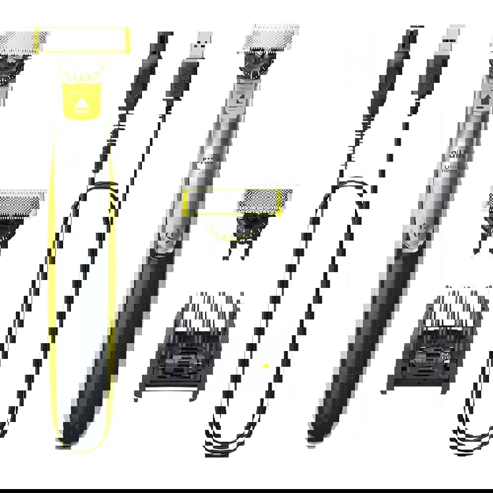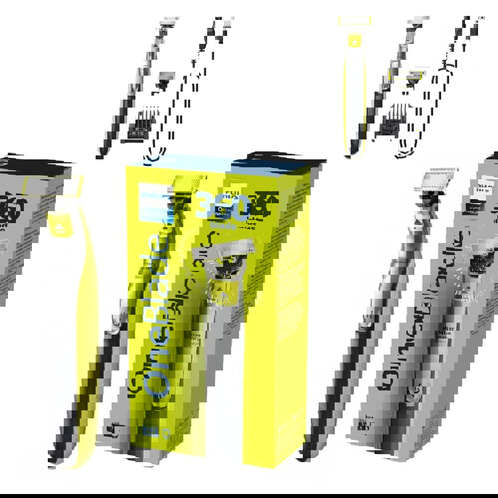 Der OneBlade 360 trimmt, stylt und rasiert jede Haarlänge einfacher als je zuvor. Selbst schwierig zu erreichende Bereiche lassen sich mit weniger Aufwand stylen. Mehrere Schritte und Werkzeuge sind nicht mehr notwendig. OneBlade übernimmt alles. Dank konturfolgender Technologie, doppeltem Schutzsystem und 360-Grad-Klinge.