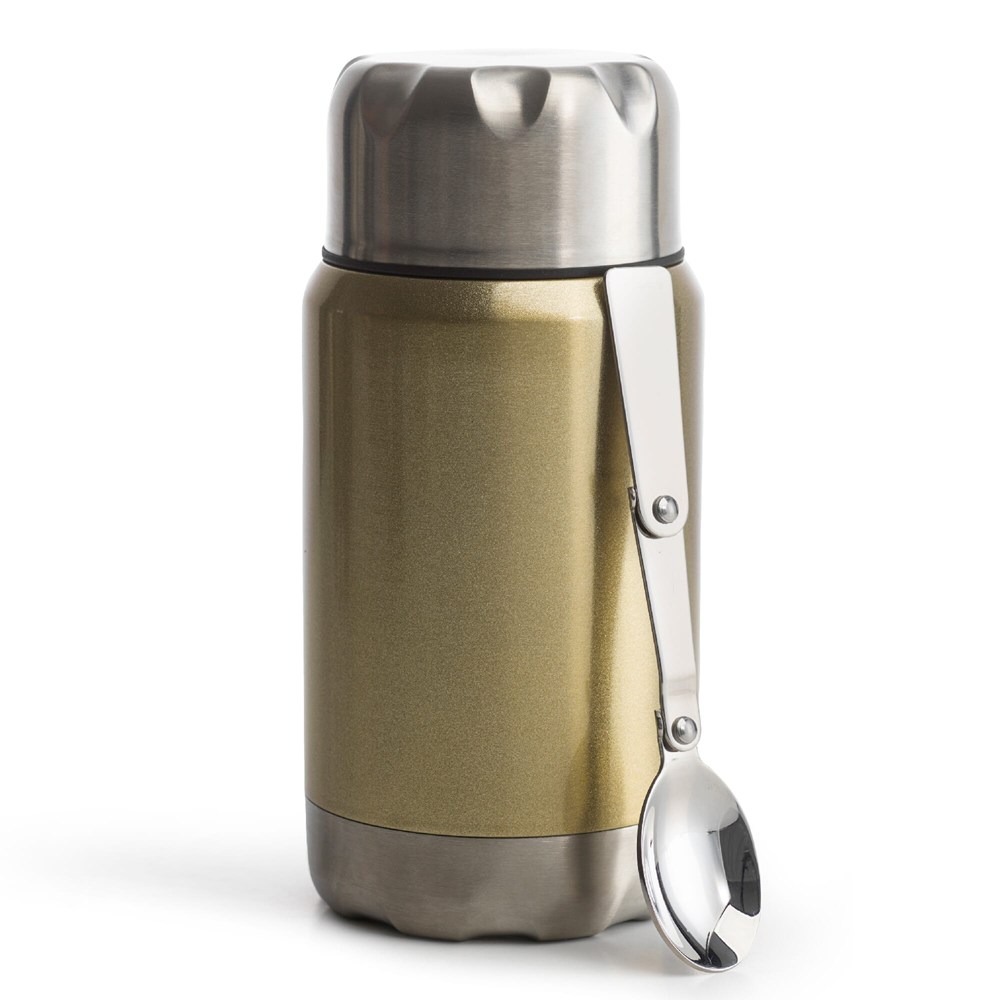 Kleine, handliche Thermosflasche mit dem gewissen Extra. Elegantes Design aus rostfreiem Stahl mit einem kleinen Klapplöffel im Deckel. Durch den großen Hals ist sie leicht zu reinigen und eignet sich perfekt zum Befüllen mit z. B. Suppe. Hält Ihre Speisen oder Getränke 24 Stunden lang eiskalt oder 12 Stunden lang heiß.