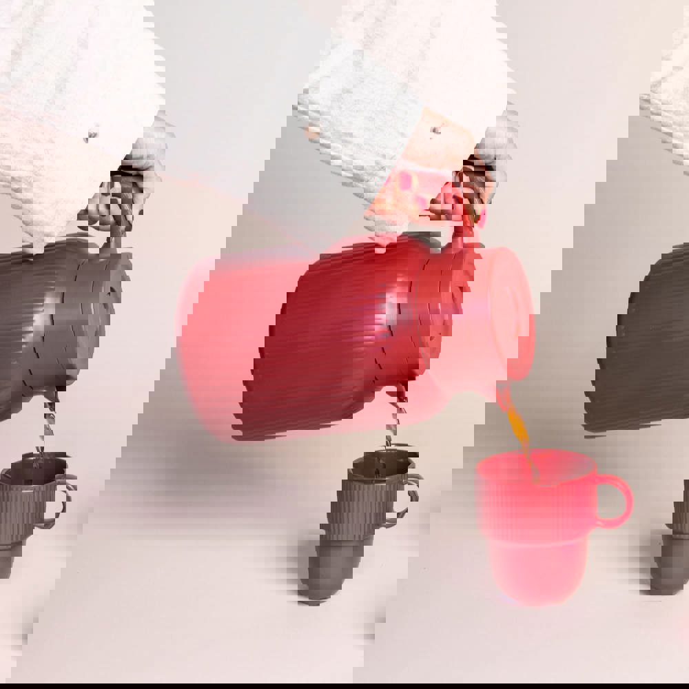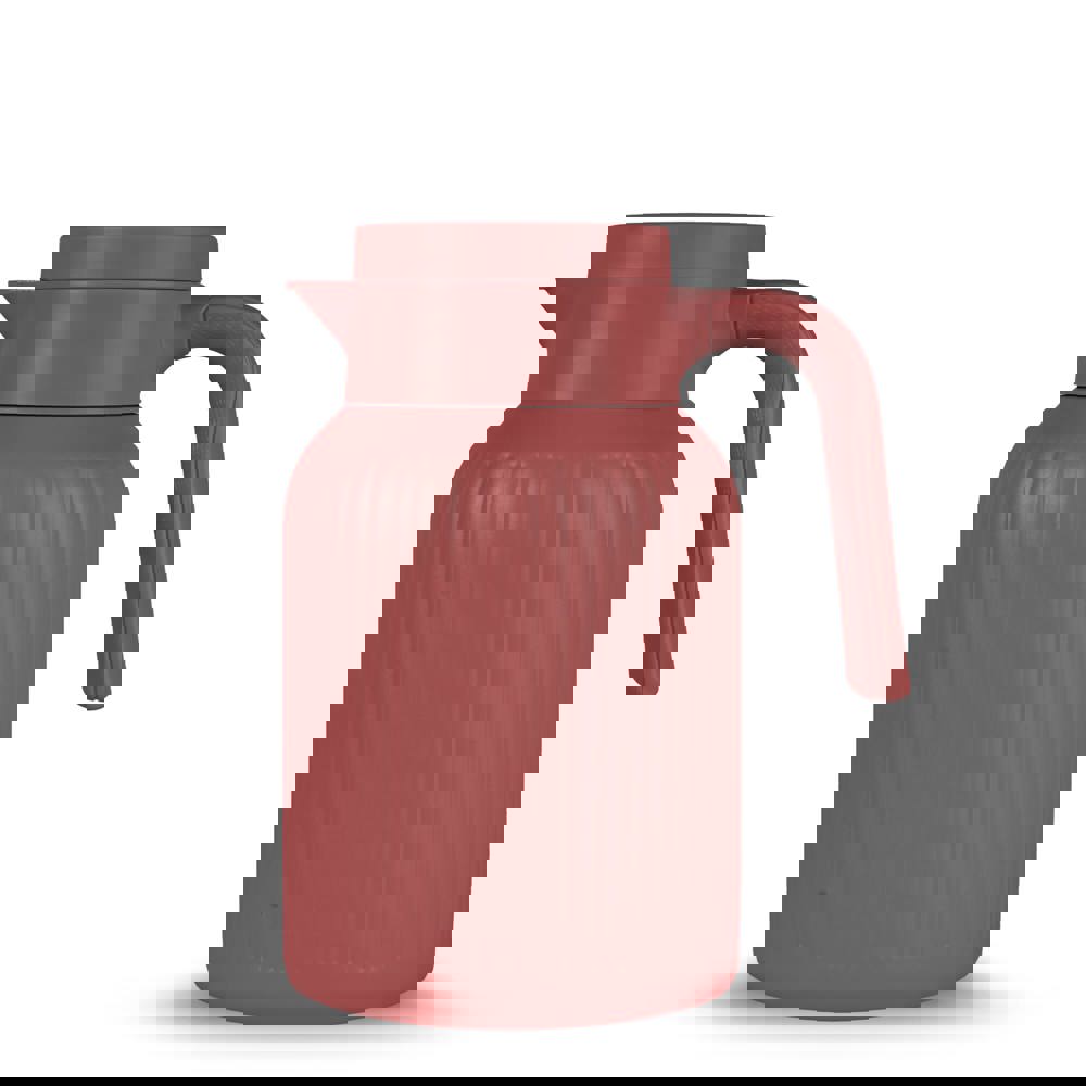 Sagaform Trine ist eine stilvolle 1.5 L Thermoskanne für Familie und Business. Zeitloses Design mit weichen Linien, eleganten Rippen und matter Oberfläche. Vakuumisolierung und Kupferbeschichtung halten Getränke 12h warm, 24h kalt. Druckverschluss und abnehmbarer Schraubverschluss. Spülmaschinenfest.