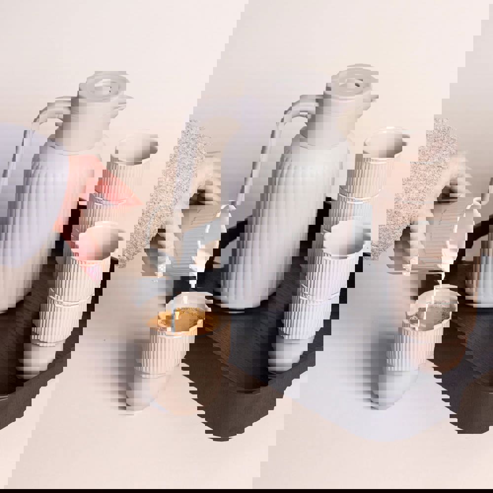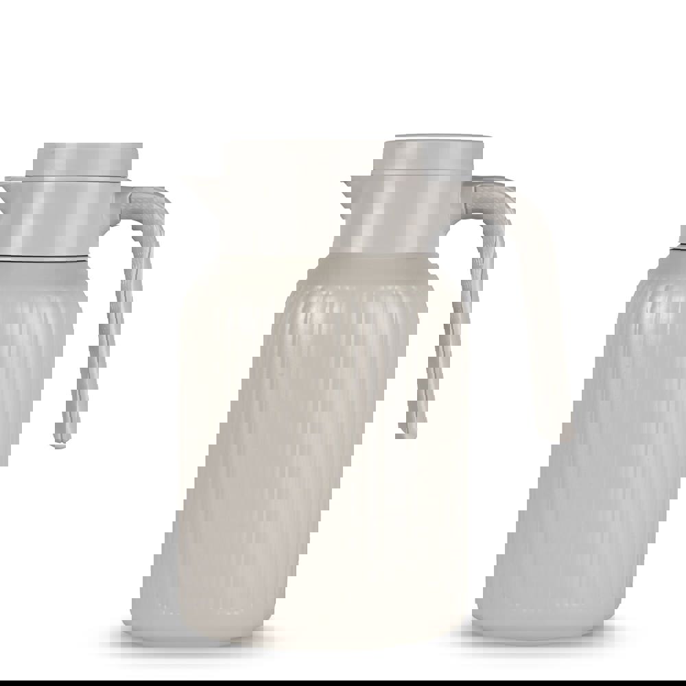Sagaform Trine ist eine stilvolle 1.5 L Thermoskanne für Familie und Business. Zeitloses Design mit weichen Linien, eleganten Rippen und matter Oberfläche. Vakuumisolierung und Kupferbeschichtung halten Getränke 12h warm, 24h kalt. Druckverschluss und abnehmbarer Schraubverschluss. Spülmaschinenfest.