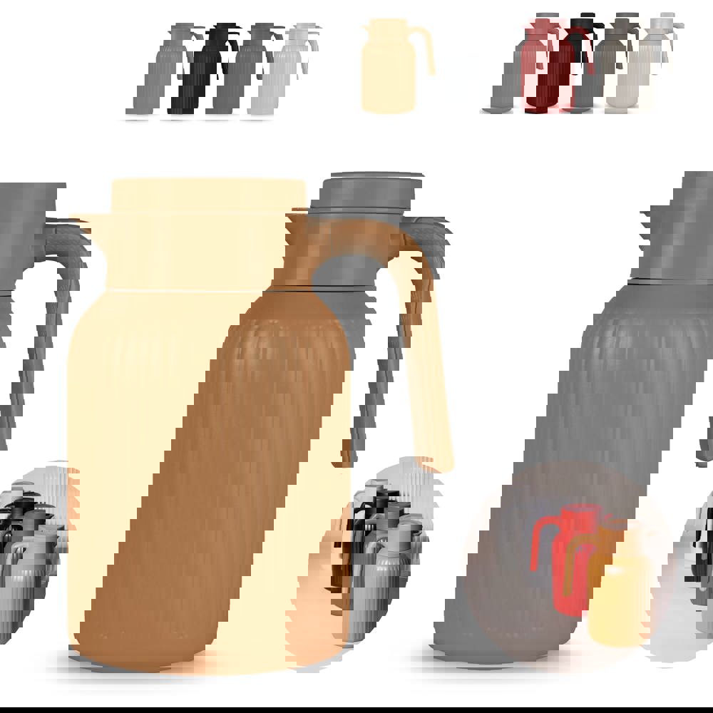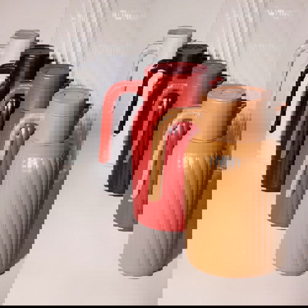 Sagaform Trine ist eine stilvolle 1.5 L Thermoskanne für Familie und Business. Zeitloses Design mit weichen Linien, eleganten Rippen und matter Oberfläche. Vakuumisolierung und Kupferbeschichtung halten Getränke 12h warm, 24h kalt. Druckverschluss und abnehmbarer Schraubverschluss. Spülmaschinenfest.