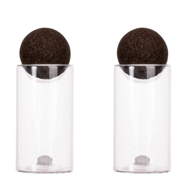 Kleine Glasgefäße für Salz und Pfeffer mit einem dunklen Korkball. Eine hübsche und klassische Kombination, die nie aus der Mode kommt. Diese Gläser bewahren Salz und Pfeffer auf natürliche Weise auf und sind ein Zeichen für eine bewusste Entscheidung. Wir lieben Kork, das haltbarste aller organischen Materialien. Außerdem ist er völlig flüssigkeitsdicht. Salz- und Pfeffergläser, die Sie immer in Sichtweite haben wollen. Wird im 2er-Pack geliefert.