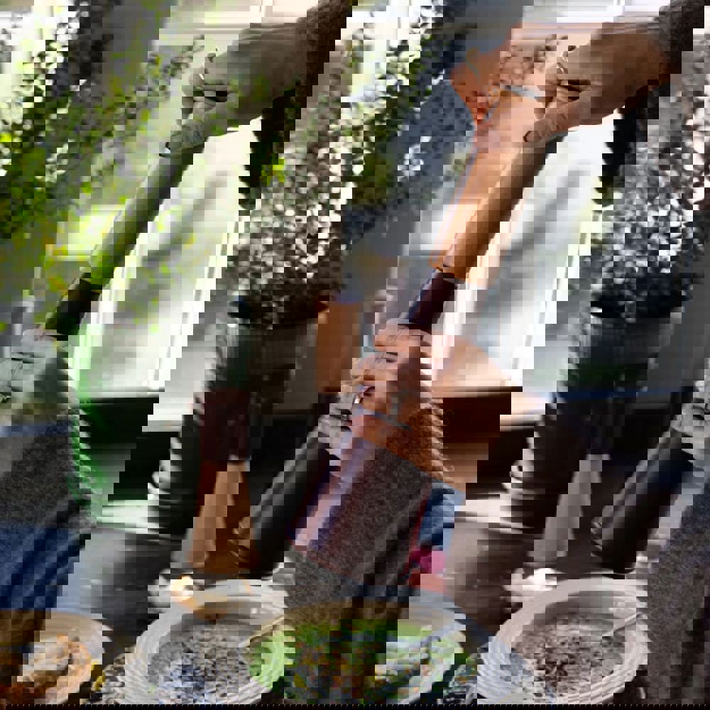 Die Sagaform Salz- oder Pfeffermühle "Gurken" groß ist aus Holz, entworfen von Daniel Enoksson. Inspiriert von Berglandschaften hat die Mühle eine konische Form mit einem zeitlosen Design. Sie besteht aus zertifiziertem Buchenholz und verfügt über einen einstellbaren Keramikmahlwerk. Höhe: 32 cm. Wird in einer luxuriösen Geschenkverpackung geliefert.