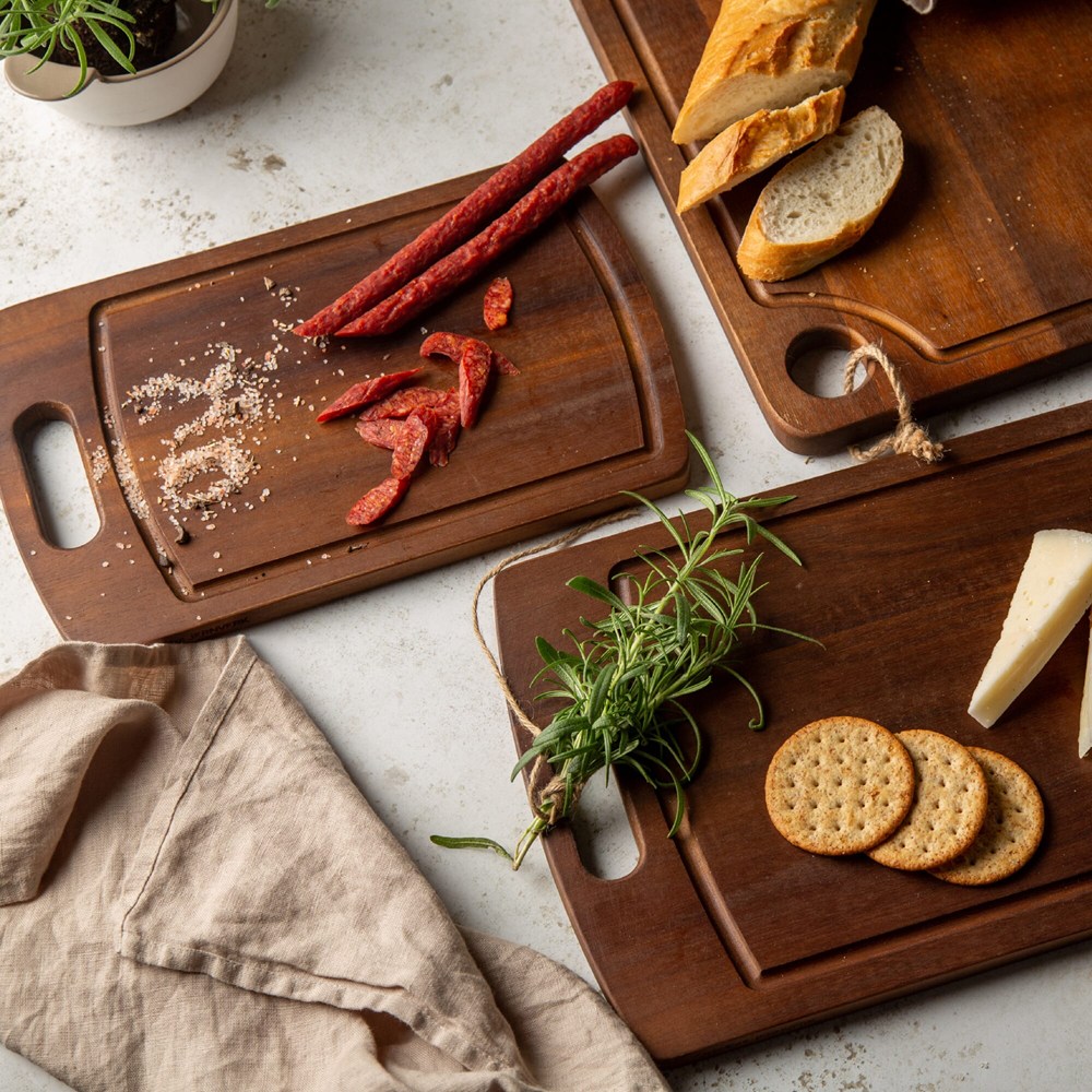 2er-Set Schneidebretter aus schönem Akazienholz der schwedischen Marke Orrefors Jernverk. Die hölzernen Schneidebretter sollten in der Küche auf keinen Fall fehlen. Die Schneidebretter haben einen stabilen Griff am kurzen Ende und eine Kerbe auf der Oberseite, die Flüssigkeit sammelt. Diese Schneidebretter sind leicht und daher einfach zu benutzen. Das Akazienholz verleiht ihnen außerdem einen schönen Glanz.