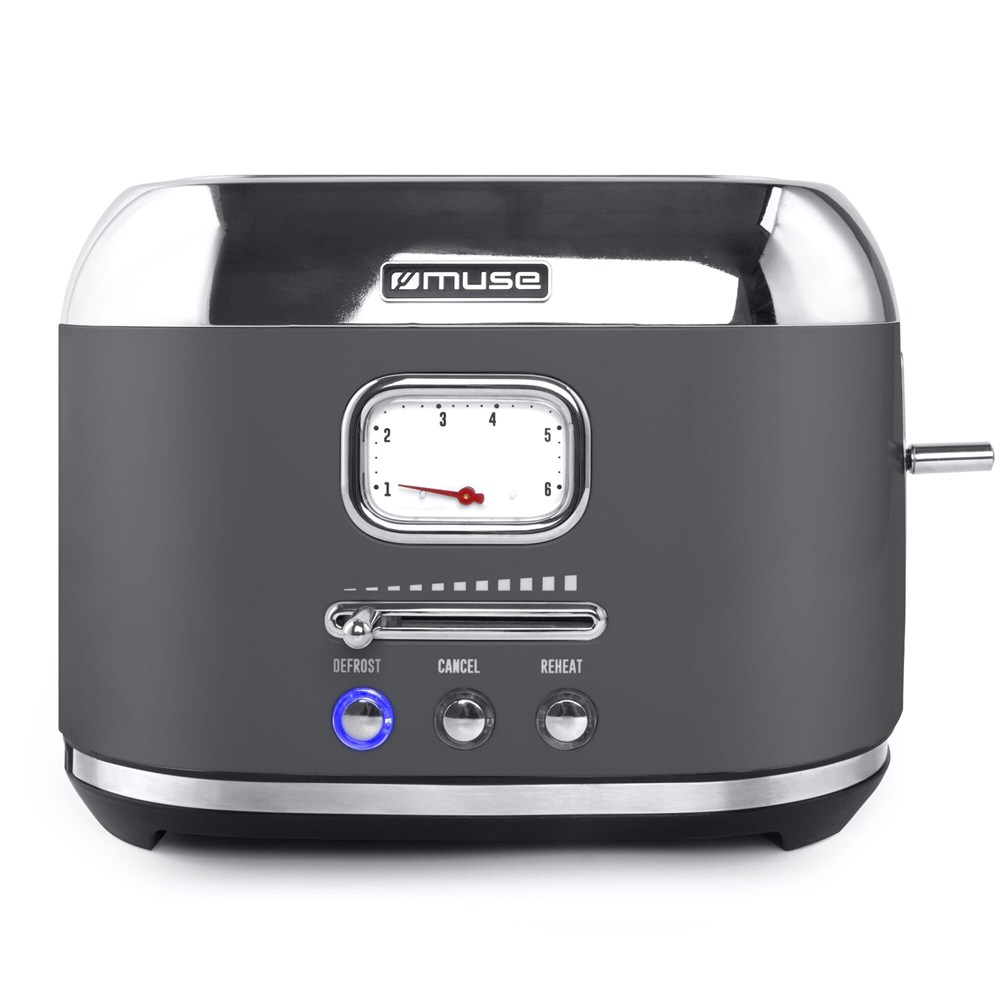 Bringen Sie leckeren Toast auf den Tisch mit diesem schön gestalteten Toaster von Muse. Dieser Toaster im Retro-Stil bietet Platz für zwei Toasts. Der Toaster verfügt über sechs Toastmodi, die auf dem Analogdisplay angezeigt werden. Außerdem verfügt er über eine Stopptaste, mit der Sie den Toastvorgang auch vor Ablauf der Zeit abbrechen können. Neben dem Toasten können Sie auch Brot auftauen. Außerdem erleichtert das herausziehbare Krümelfach die Reinigung.