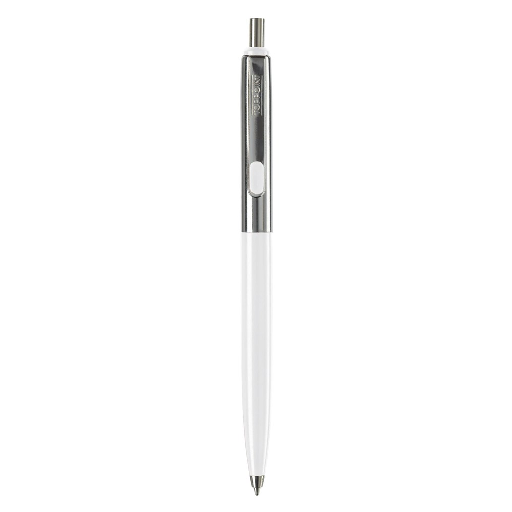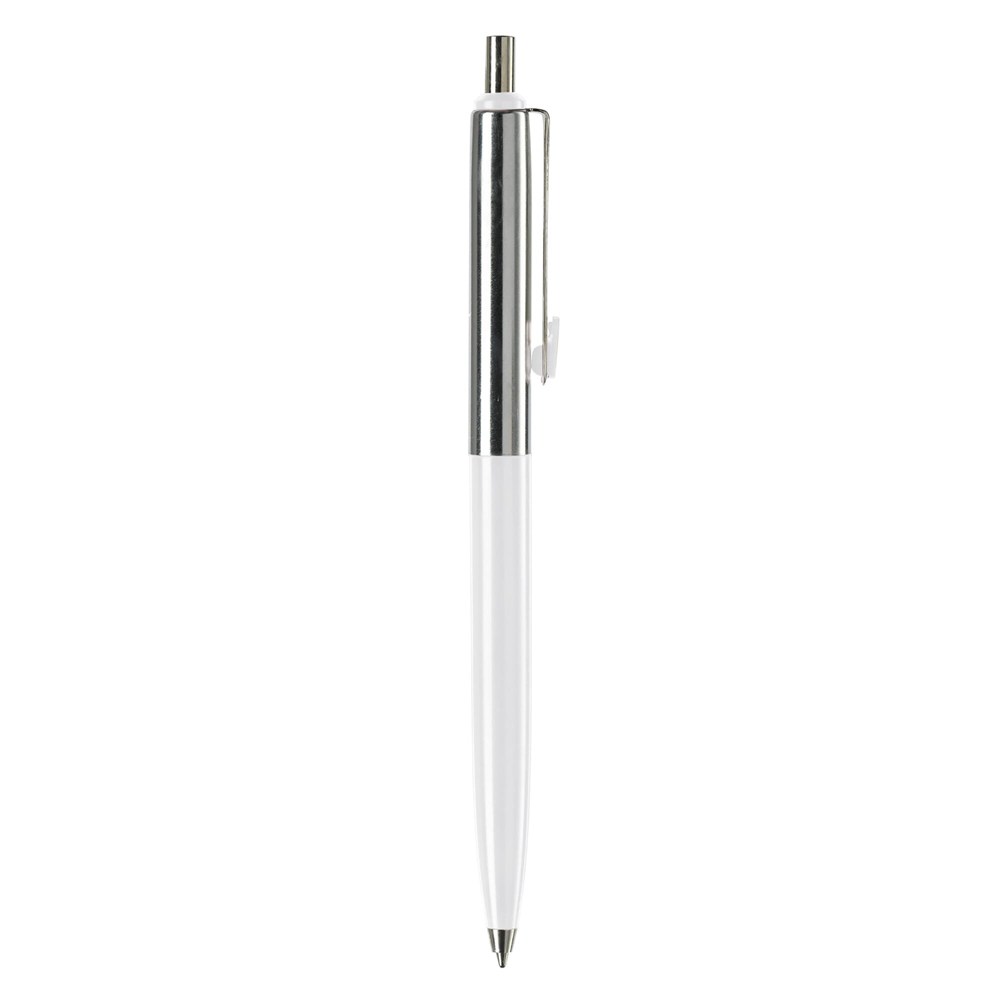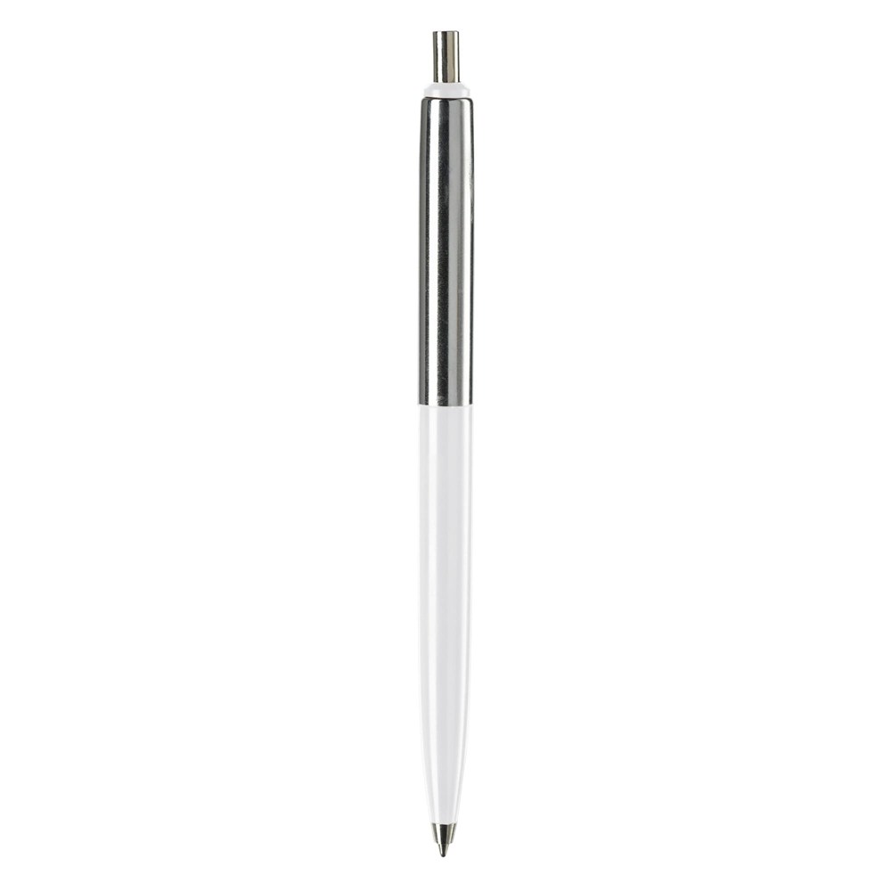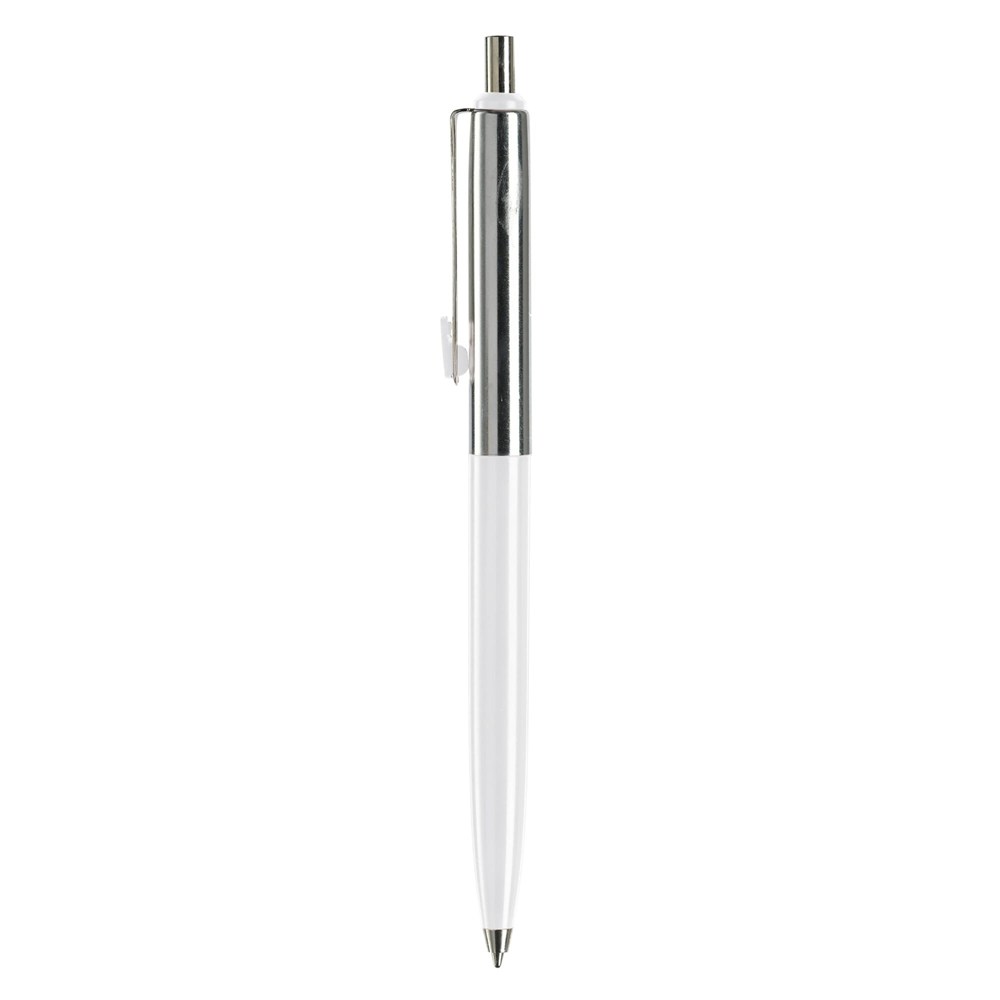 Klassischer Metallkugelschreiber. Farbige und verchromte Elemente. Blauschreibende Metallmine mit langer Schreibleistung.