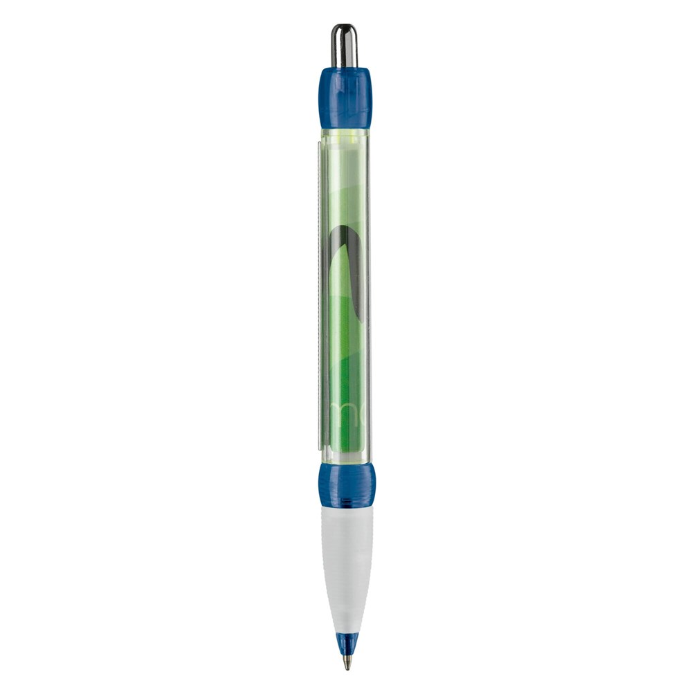 Transparenter Kugelschreiber mit Gummimanschette und integriertem Werbebanner, beidseitig in Full-colour. Ein optimaler und kompletter Werbeträger! Ausgestattet mit blauer X20-Mine. Werbeanbringung zusätzlich auf dem Schaft oder dem Clip möglich. Lieferzeit ca. 6 Wochen.