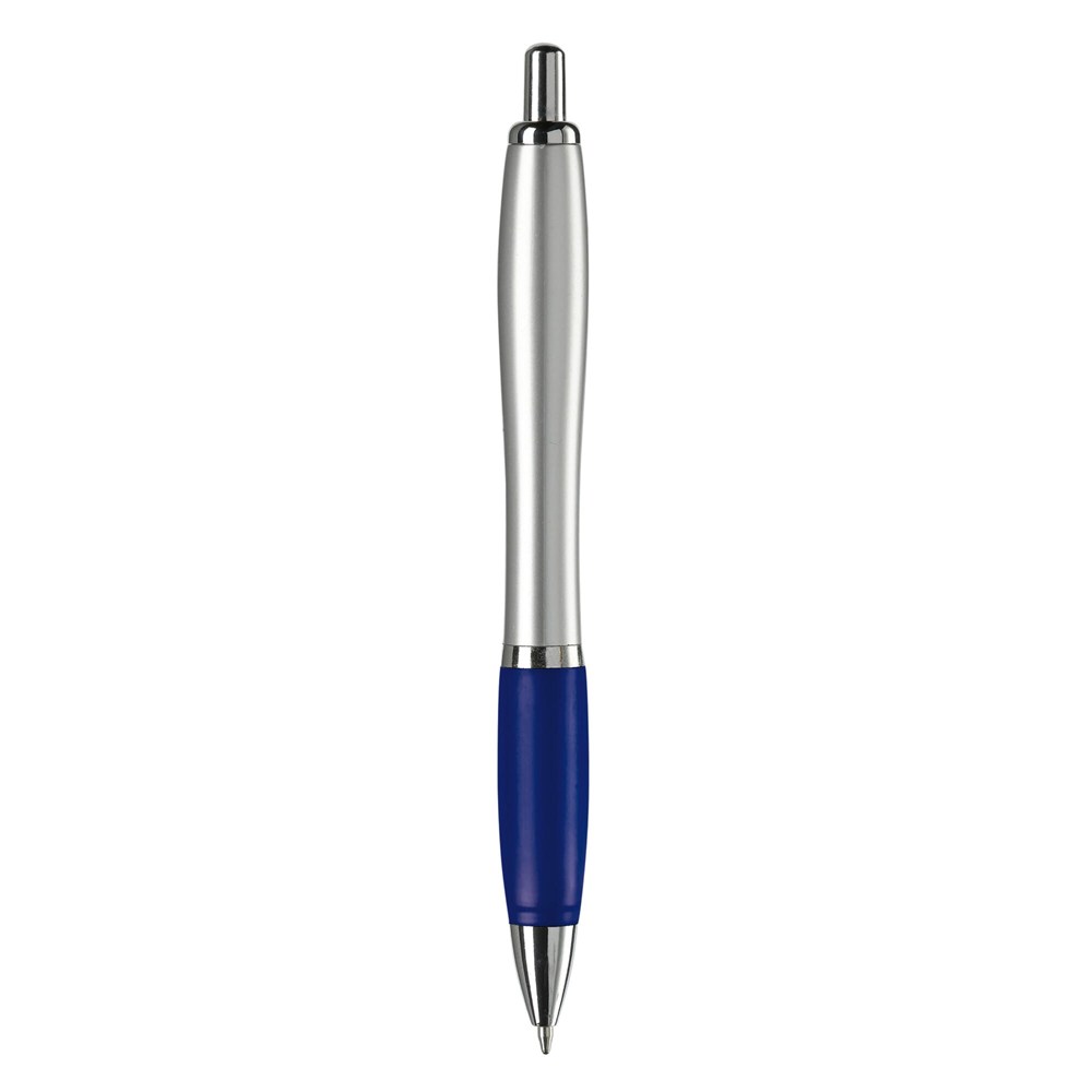 Stilvoller silberfarbener Kugelschreiber mit farbigen Griff. Metallclip, Drücker, Zwischenring und Spitze. Blauschreibende Jumbo-Mine mit langer Schreibleistung.