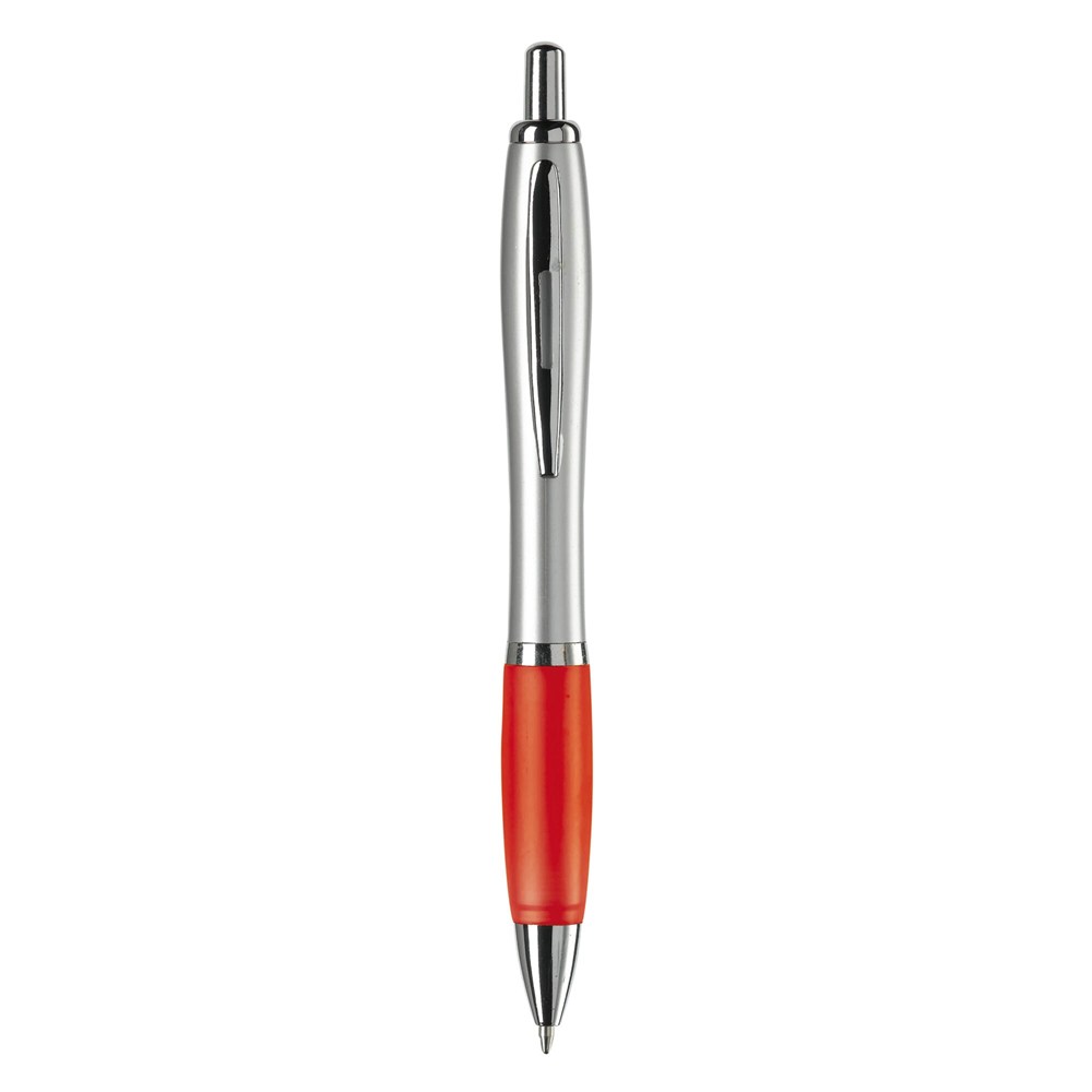 Stilvoller silberfarbener Kugelschreiber mit farbigen Griff. Metallclip, Drücker, Zwischenring und Spitze. Blauschreibende Jumbo-Mine mit langer Schreibleistung.