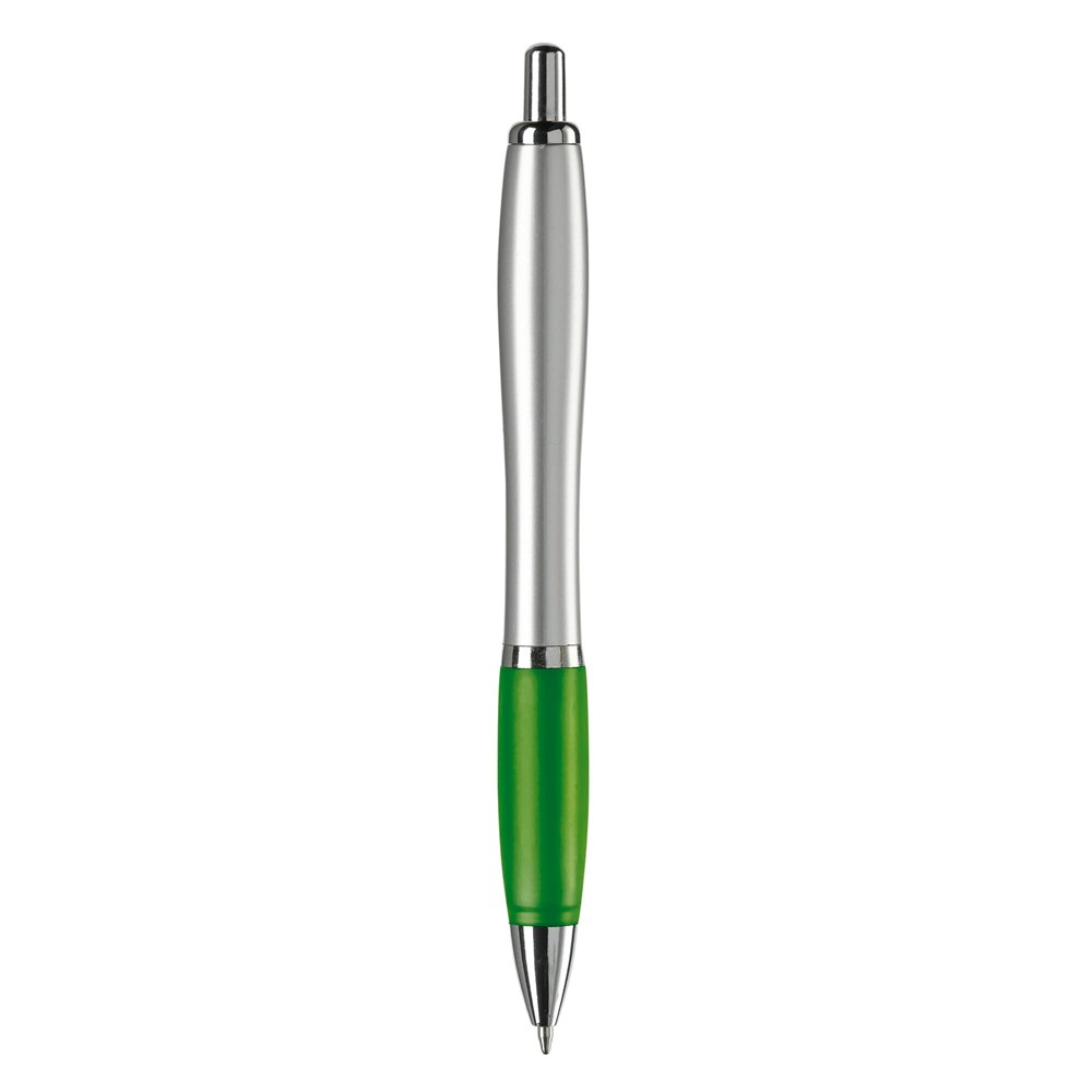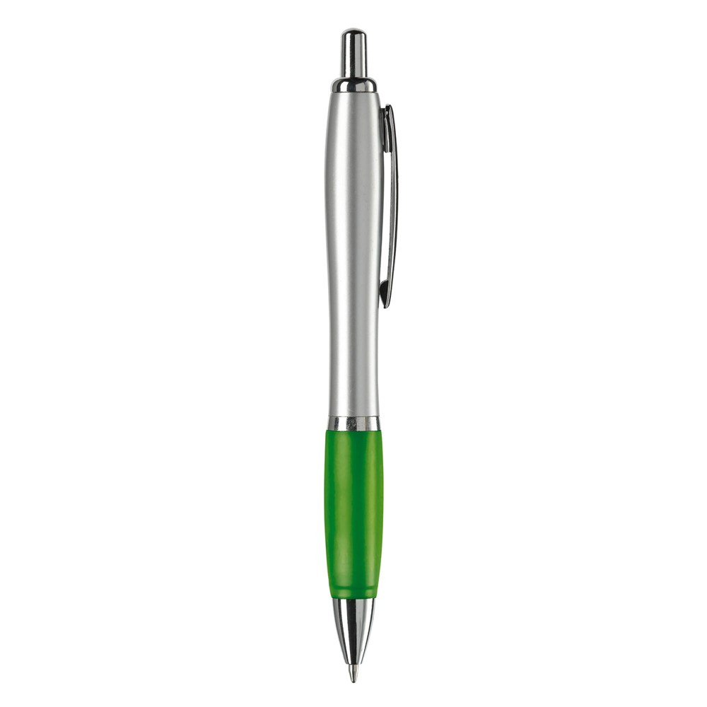 Stilvoller silberfarbener Kugelschreiber mit farbigen Griff. Metallclip, Drücker, Zwischenring und Spitze. Blauschreibende Jumbo-Mine mit langer Schreibleistung.