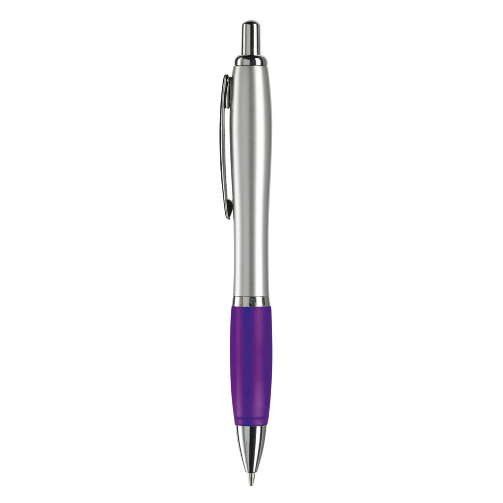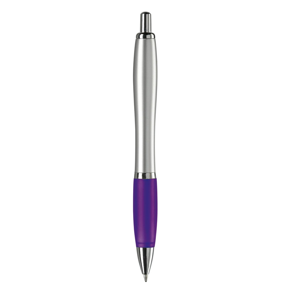 Stilvoller silberfarbener Kugelschreiber mit farbigen Griff. Metallclip, Drücker, Zwischenring und Spitze. Blauschreibende Jumbo-Mine mit langer Schreibleistung.