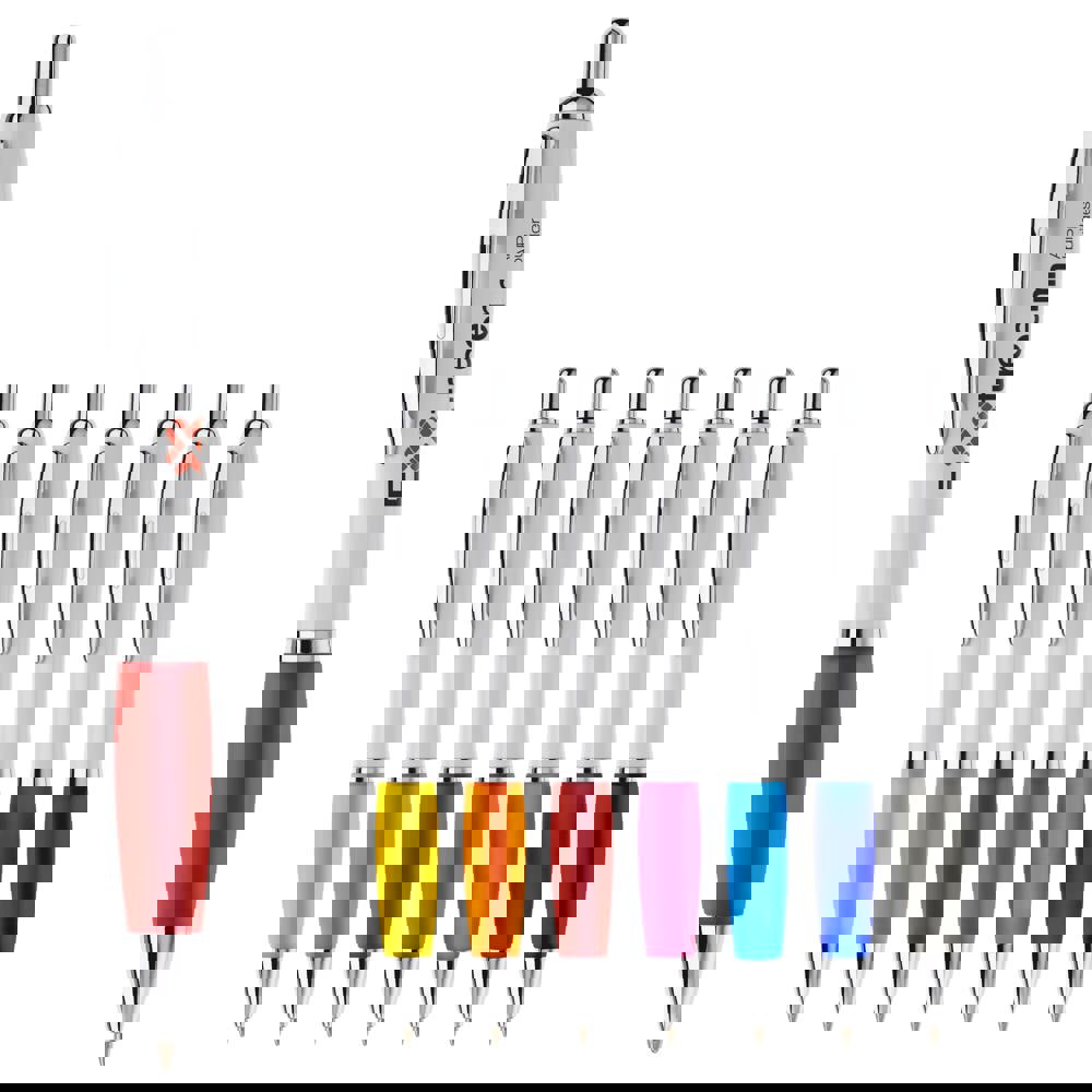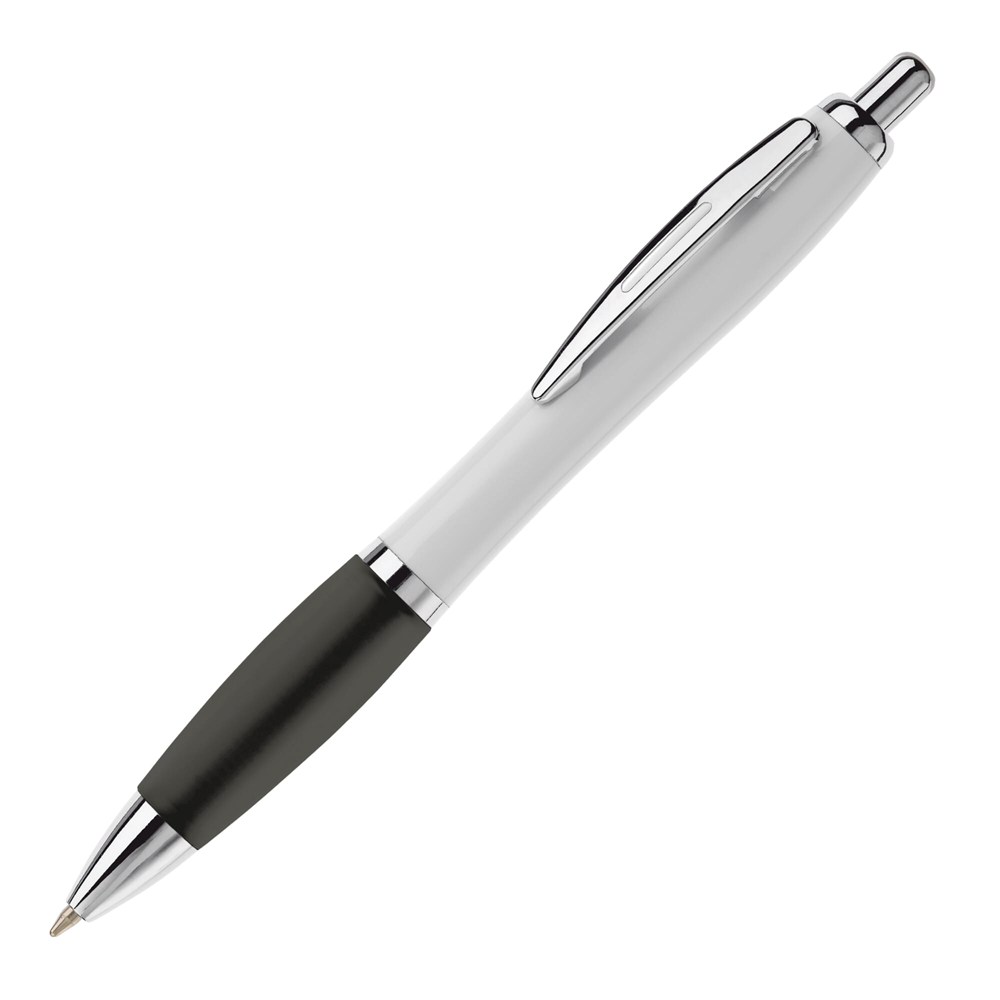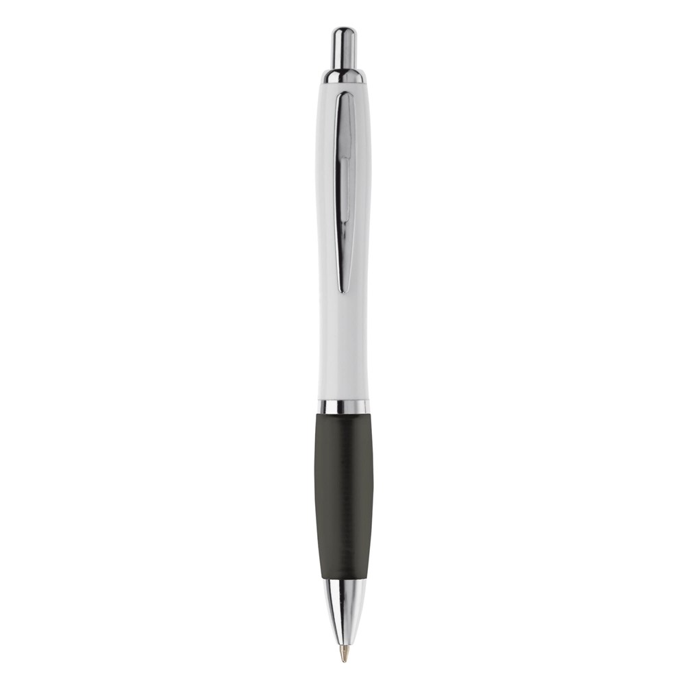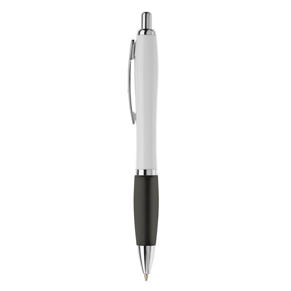 Weißer Kugelschreiber mit Metallclip, metallisierter Drücker, Ring und Spitze. Blauschreibende... mehr