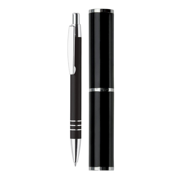 Aluminium Kugelschreiber mit 3 verchromten Ringen. Der Kugelschreiber ist in einem Aluminium Köcher verpackt.