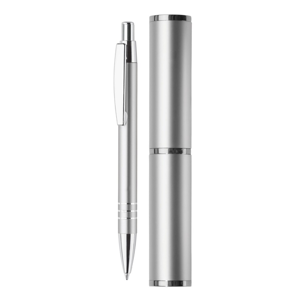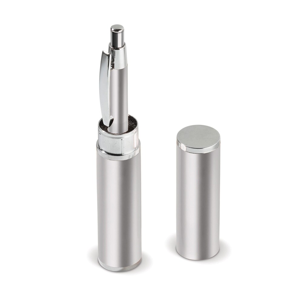 Aluminium Kugelschreiber mit 3 verchromten Ringen. Der Kugelschreiber ist in einem Aluminium Köcher verpackt.