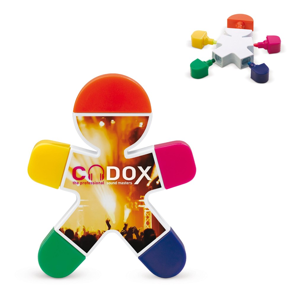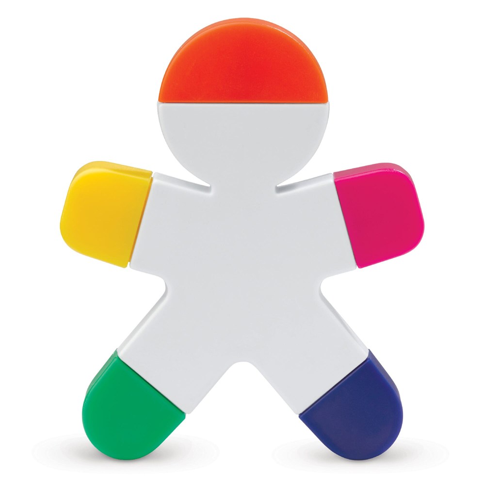 Textmarker mit Leuchtfarben in Form eines Männchens . Die Marker „Beine, Hände und Kopf“ sind vom Körper abnehmbar.