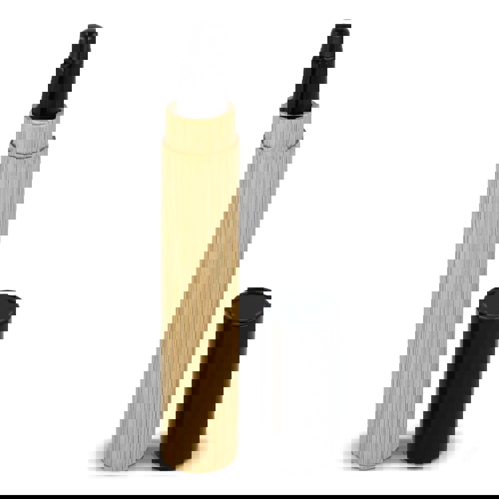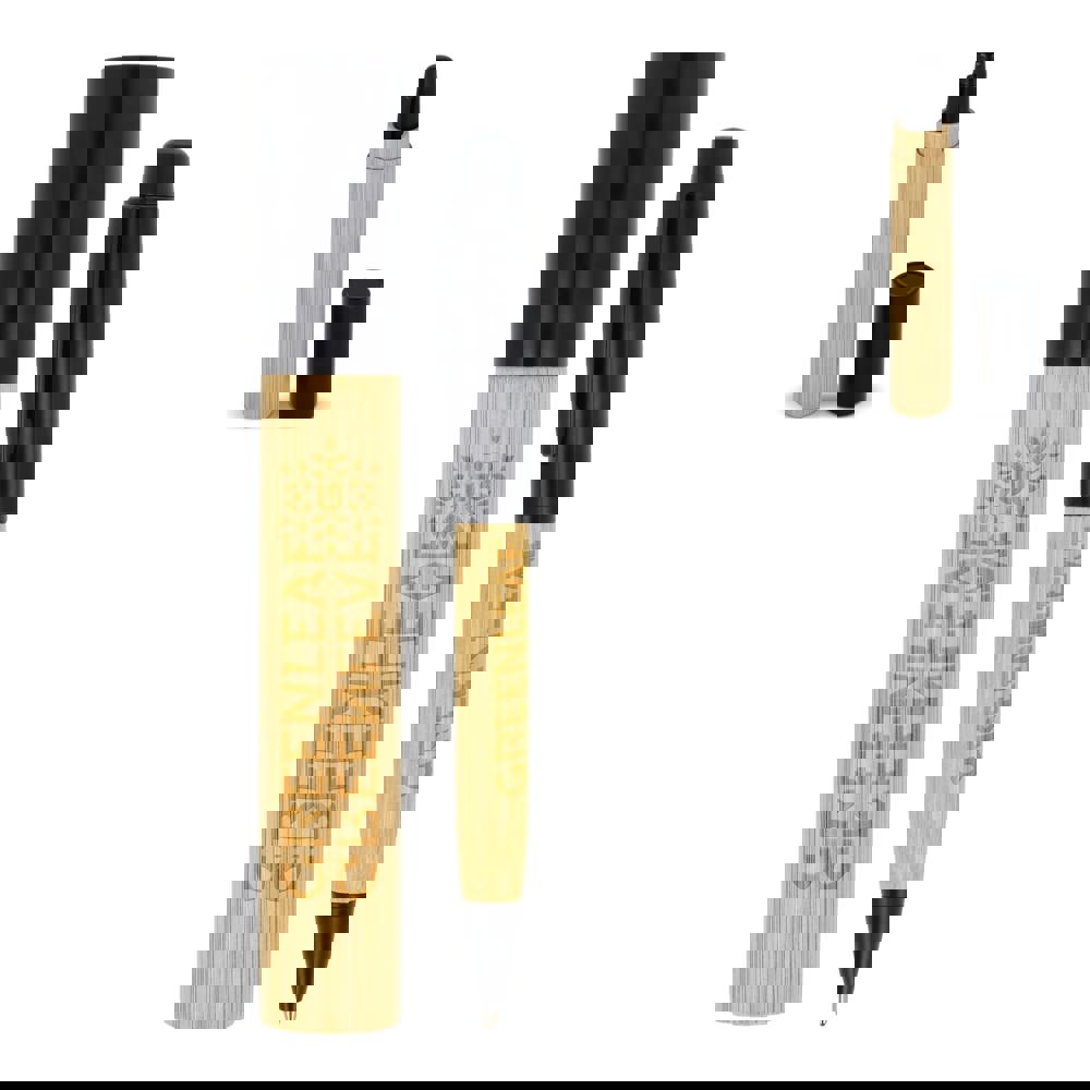 Metallkugelschreiber mit schwarzen Metallverzierungen und einem Schaft aus Bambus, elegant präsentiert in einer Bambusröhre. Der Kugelschreiber hat eine blaue Mine.