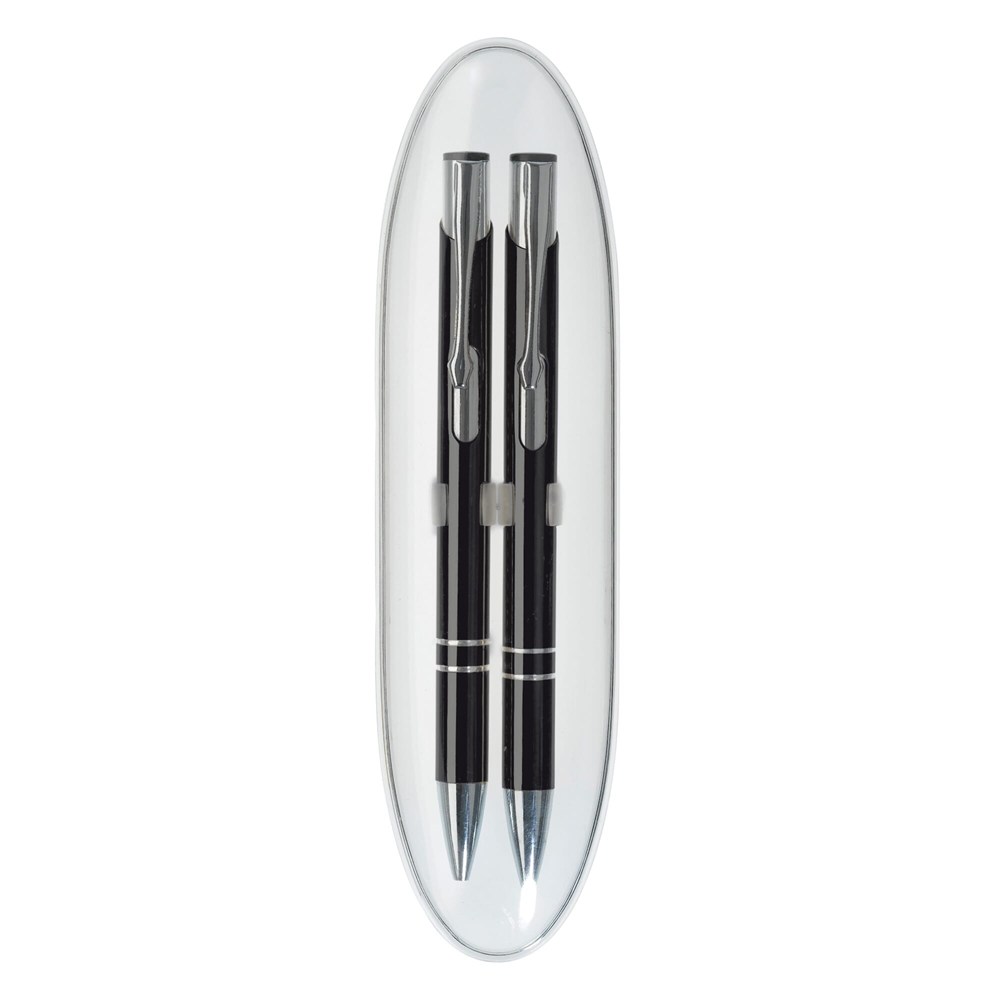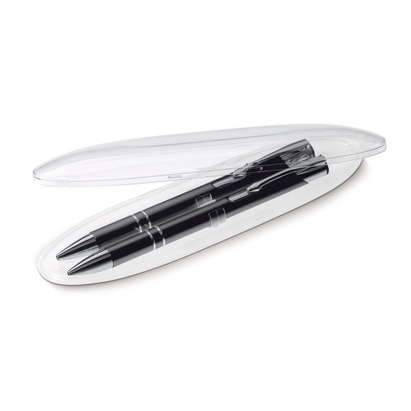 Schreibset mit dem Kugelschreiber Alicante (87915) und dem Druckbleistift Alicante (89216) in einer oval transparenten Geschenkverpackung (83006). Werbeanbringung Standard auf beiden Schreibgeräten, jedoch auch auf der Verpackung möglich.