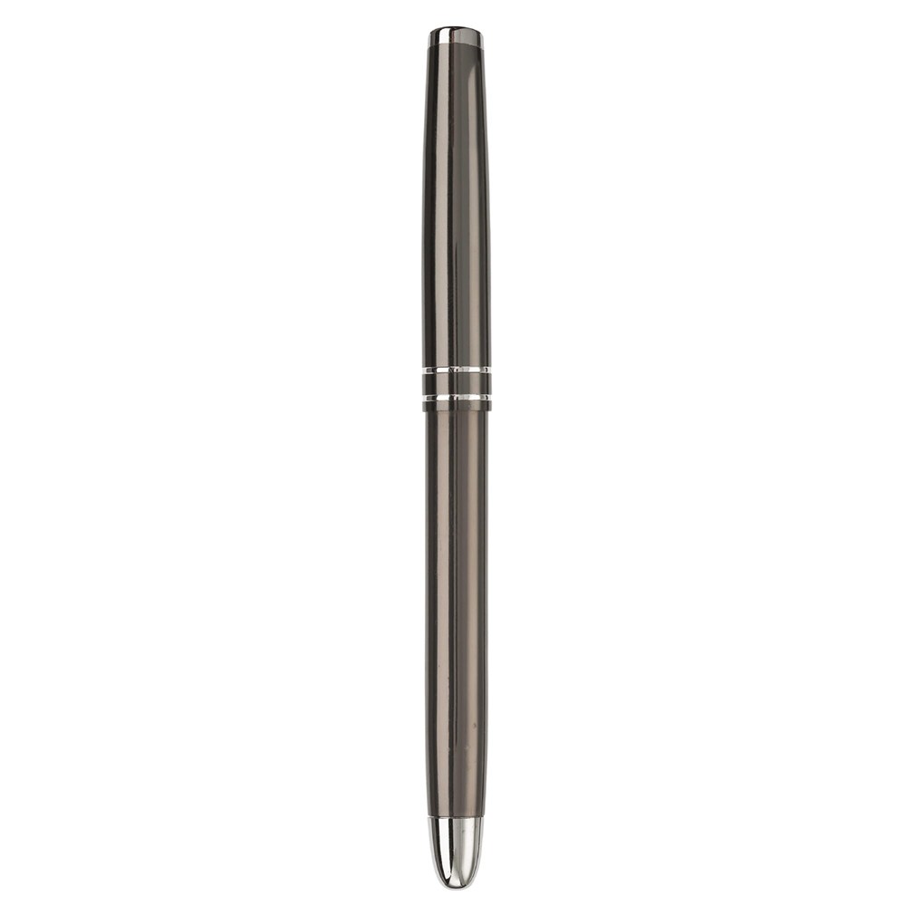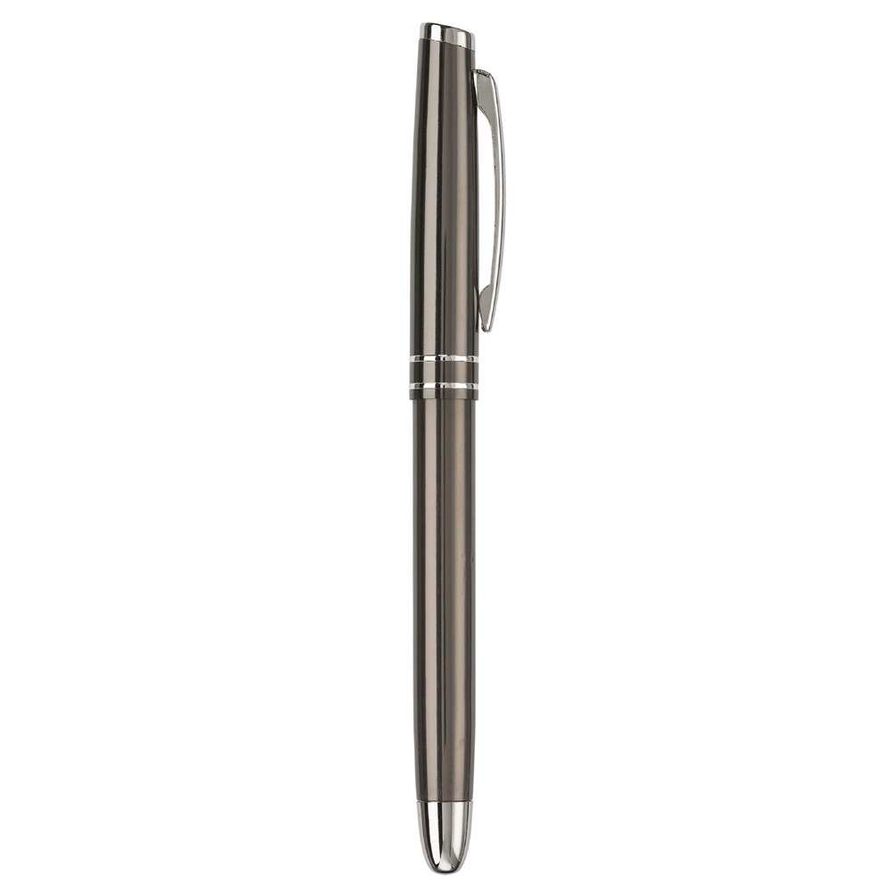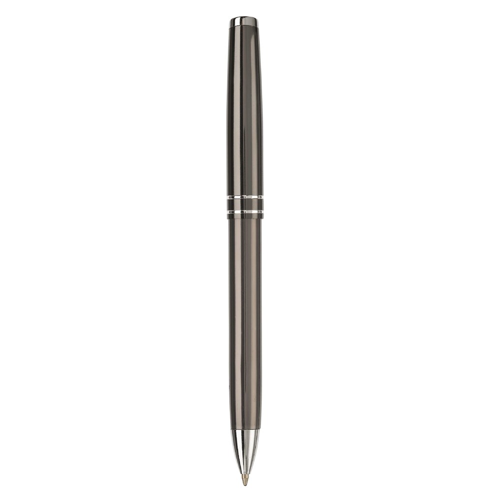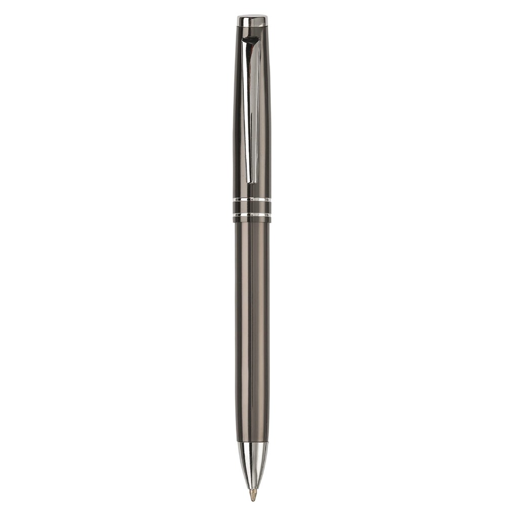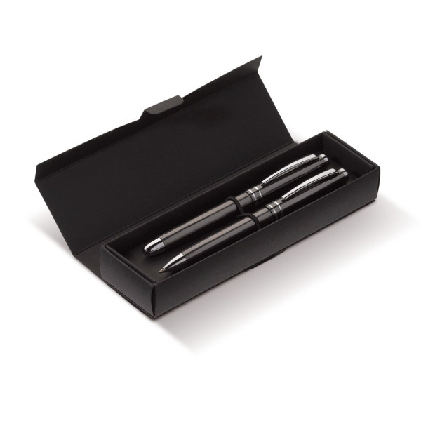 Metallschreibset bestehend aus einem Kugelschreiber mit Drehmechanik und einem Rollerball mit Kappe. Versehen mit einem feinen Streifendesign. Blauschreibend.