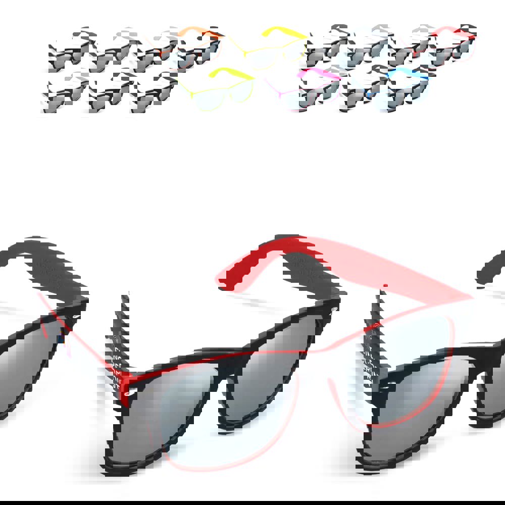 Stylische Sonnenbrille mit trendigem zweifarbigem Rahmen und auffälligen Spiegelgläsern. UV400-Filter. Eine moderne Wahl für auffällige Promotions und Events.