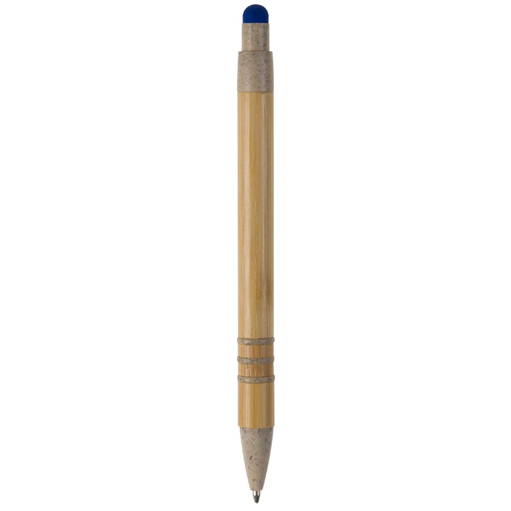 Kugelschreiber mit Bambusschaft. Spitze, Clip, Drücker und Schaftringe bestehen aus Weizenstroh. Auf dem Drücker befindet sich ein farbiger Stylus zur Smartphone-Nutzung. Ein vielseitiger Werbeartikel, ausgestattet mit einer blau schreibenden Jumbo-Mine.