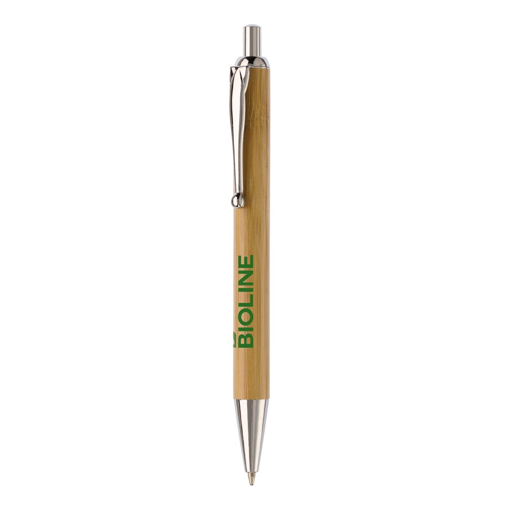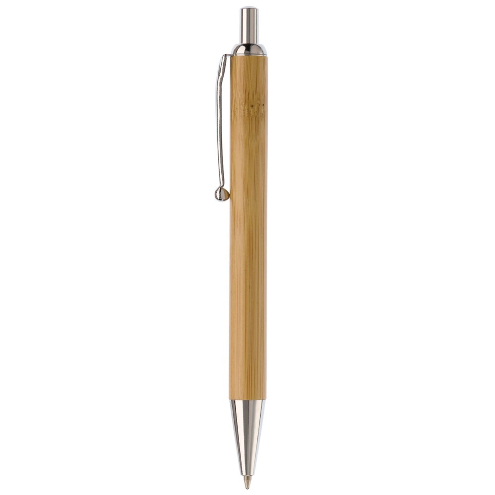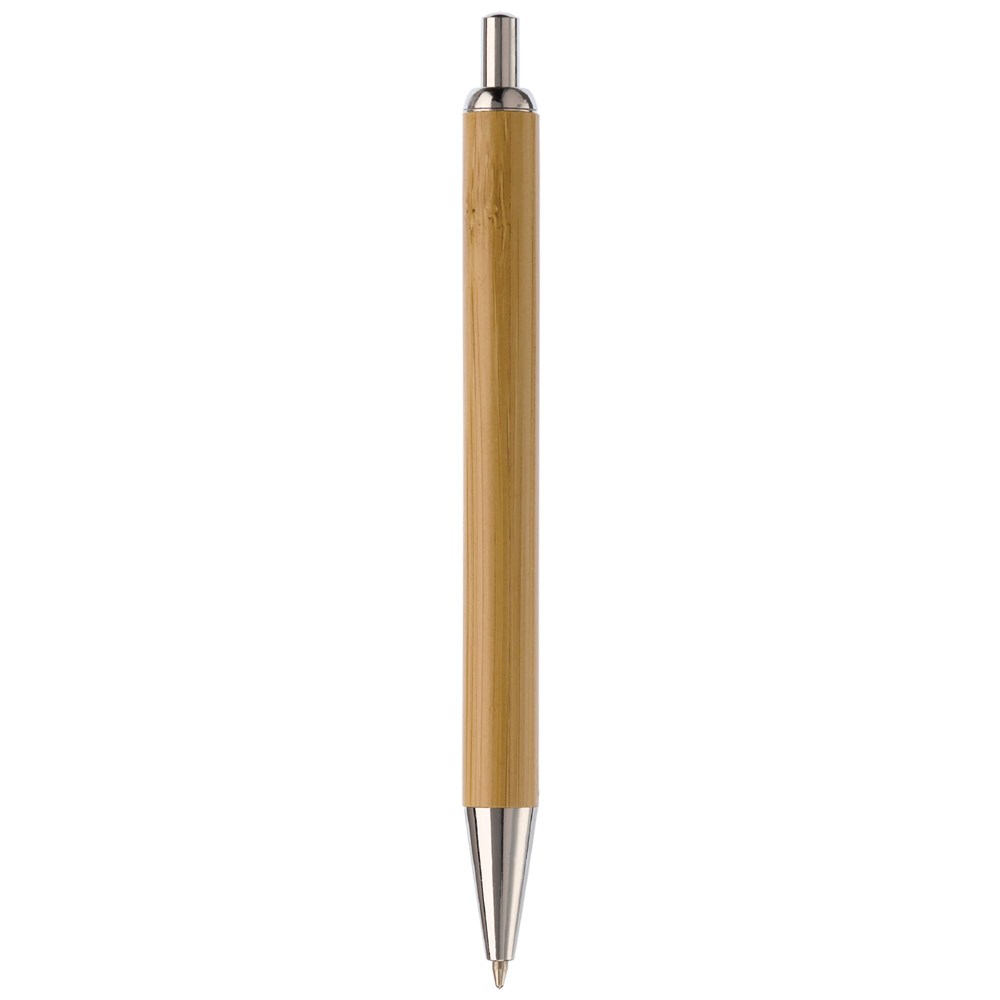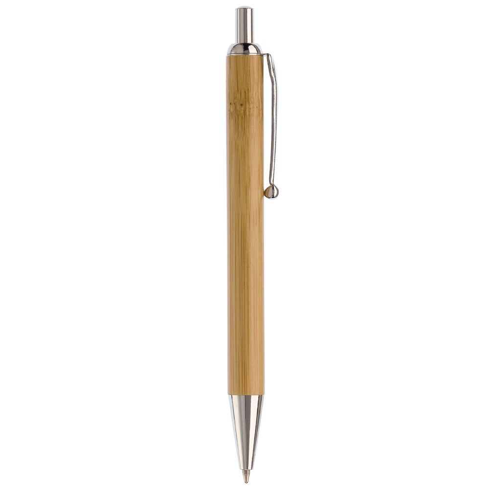 Kugelschreiber aus Bambus mit Metallclip und metallisierter Spitze. Der Kugelschreiber hat eine schwarzschreibende Mine.