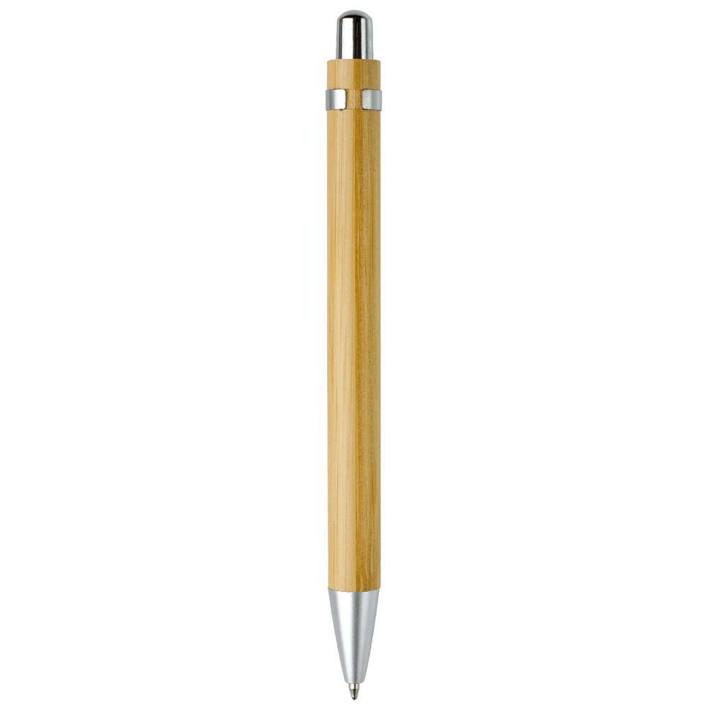 Kugelschreiber aus Bambus Material mit einem Metallclip, metallisiertem Drücker und metallisierter Spitze. Die Standard Schriftfarbe ist blau.