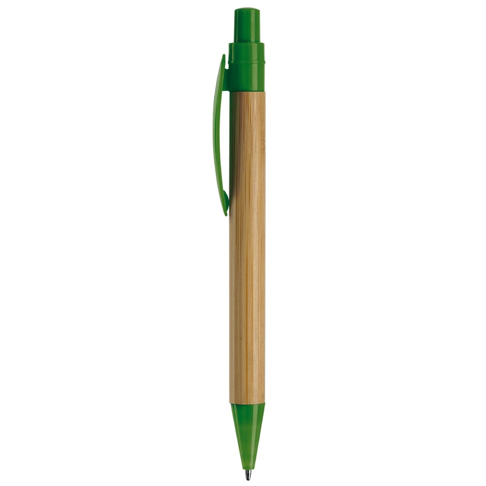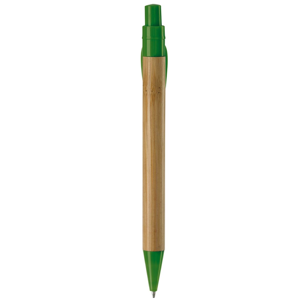 Bambuskugelschreiber mit Clip in Blattform. Farbiger Drücker und Unterteil, ausgestattet mit einer X20-Mine mit schwarzer Tinte. Bedruckung auf dem Clip möglich.